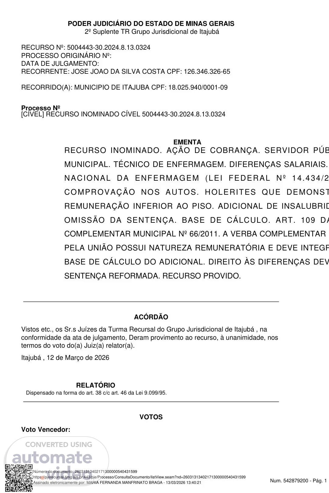 Num. 542879200 - Pág. 1 Assinado eletronicamente por: MARIA FERNANDA MANFRINATO BRAGA - 13/03/2026 13:40:21 https://pjerecursal.tjmg.jus.br:443/pje/Processo/ConsultaDocumento/listView.seam?nd=26031313402171300000540431599 Número do documento: 26031313402171300000540431599 PODER JUDICIÁRIO DO ESTADO DE MINAS GERAIS 2º Suplente TR Grupo Jurisdicional de Itajubá RECURSO Nº: 5004443-30.2024.8.13.0324 PROCESSO ORIGINÁRIO Nº: DATA DE JULGAMENTO: RECORRENTE: JOSE JOAO DA SILVA COSTA CPF: 126.346.326-65 RECORRIDO(A): MUNICIPIO DE ITAJUBA CPF: 18.025.940/0001-09 Processo Nº [CÍVEL] RECURSO INOMINADO CÍVEL 5004443-30.2024.8.13.0324 EMENTA RECURSO INOMINADO. AÇÃO DE COBRANÇA. SERVIDOR PÚB MUNICIPAL. TÉCNICO DE ENFERMAGEM. DIFERENÇAS SALARIAIS. NACIONAL DA ENFERMAGEM (LEI FEDERAL Nº 14.434/2 COMPROVAÇÃO NOS AUTOS. HOLERITES QUE DEMONST REMUNERAÇÃO INFERIOR AO PISO. ADICIONAL DE INSALUBRID OMISSÃO DA SENTENÇA. BASE DE CÁLCULO. ART. 109 DA COMPLEMENTAR MUNICIPAL Nº 66/2011. A VERBA COMPLEMENTAR PELA UNIÃO POSSUI NATUREZA REMUNERATÓRIA E DEVE INTEGR BASE DE CÁLCULO DO ADICIONAL. DIREITO ÀS DIFERENÇAS DEV SENTENÇA REFORMADA. RECURSO PROVIDO. ACÓRDÃO Vistos etc., os Sr.s Juízes da Turma Recursal do Grupo Jurisdicional de Itajubá , na conformidade da ata de julgamento, Deram provimento ao recurso, à unanimidade, nos termos do voto do(a) Juiz(a) relator(a). Itajubá , 12 de Março de 2026 RELATÓRIO Dispensado na forma do art. 38 c/c art. 46 da Lei 9.099/95. VOTOS Voto Vencedor:.