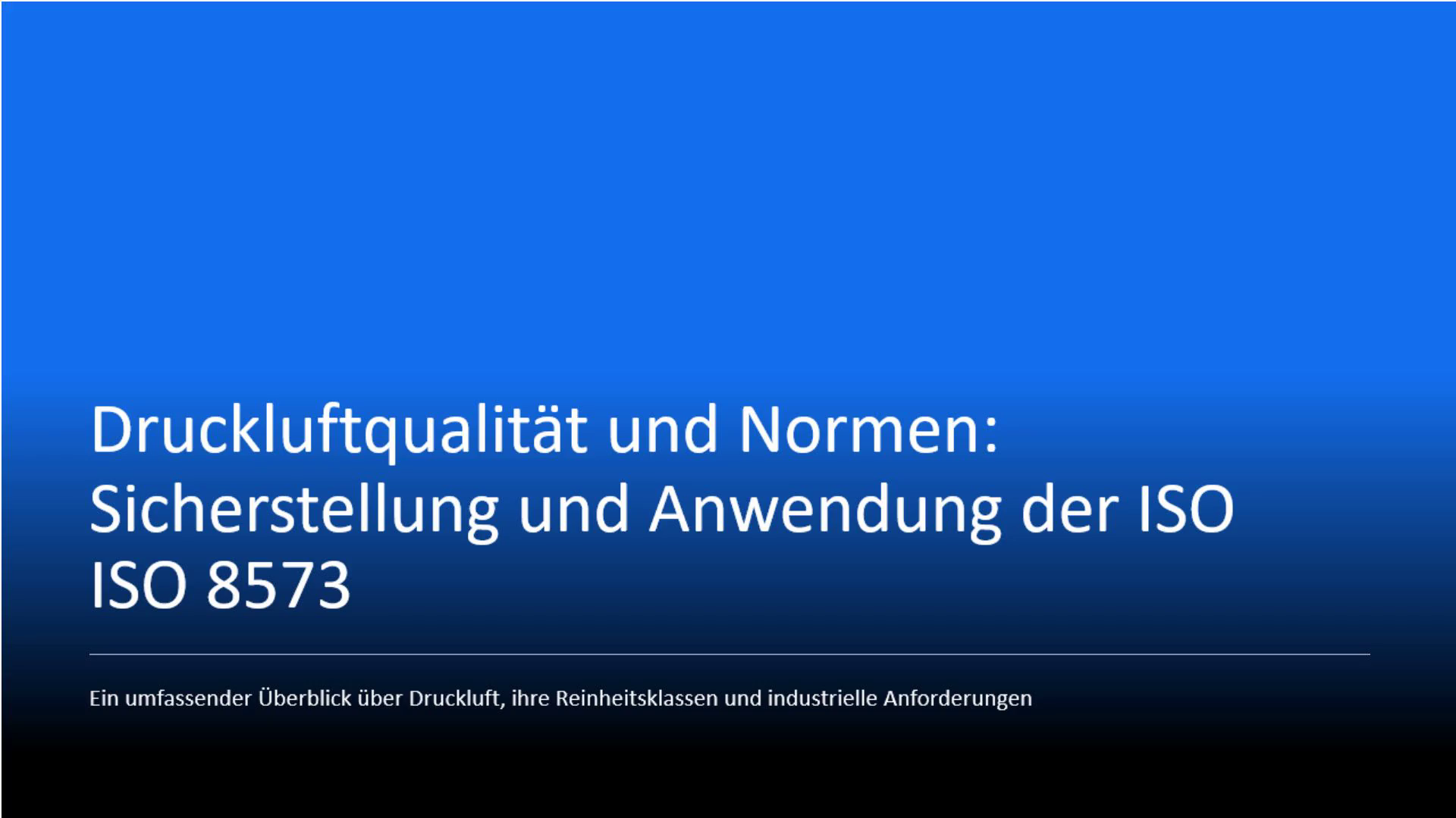 [Audio] In dieser Präsentation geben wir Ihnen einen umfassenden Überblick über das Thema Druckluft und die dazugehörigen Normen. Zunächst definieren wir Druckluft als Energieträger und erläutern ihre Bedeutung in der Industrie. Anschließend widmen wir uns der Norm ISO 8573-1, die eine zentrale Rolle bei der Sicherstellung der Druckluftqualität spielt. Wir betrachten die gesamte Normengruppe ISO 8573, ihre internationale Gültigkeit und Struktur. Danach erklären wir die verschiedenen Reinheitsklassen von Druckluft im Detail, mit einem besonderen Fokus auf die Klasse 0, die für sensible Branchen wie Lebensmittel, Kosmetik und Pharma spezifische Anforderungen stellt. Weiterhin gehen wir auf die Klassifizierung von Schmutzpartikeln ein und zeigen Methoden zur Identifikation auf. Im Anschluss stellen wir innovative Technologien zur Druckluftaufbereitung vor. Ein weiterer Schwerpunkt liegt auf der praktischen Anwendung der Norm in pneumatischen Systemen. Abschließend betrachten wir industrielle Anwendungen und branchenspezifische Anforderungen sowie Herausforderungen und bewährte Vorgehensweisen zur Einhaltung der Norm. So erhalten Sie einen fundierten Einblick in alle relevanten Aspekte rund um Druckluftqualität und Normen..