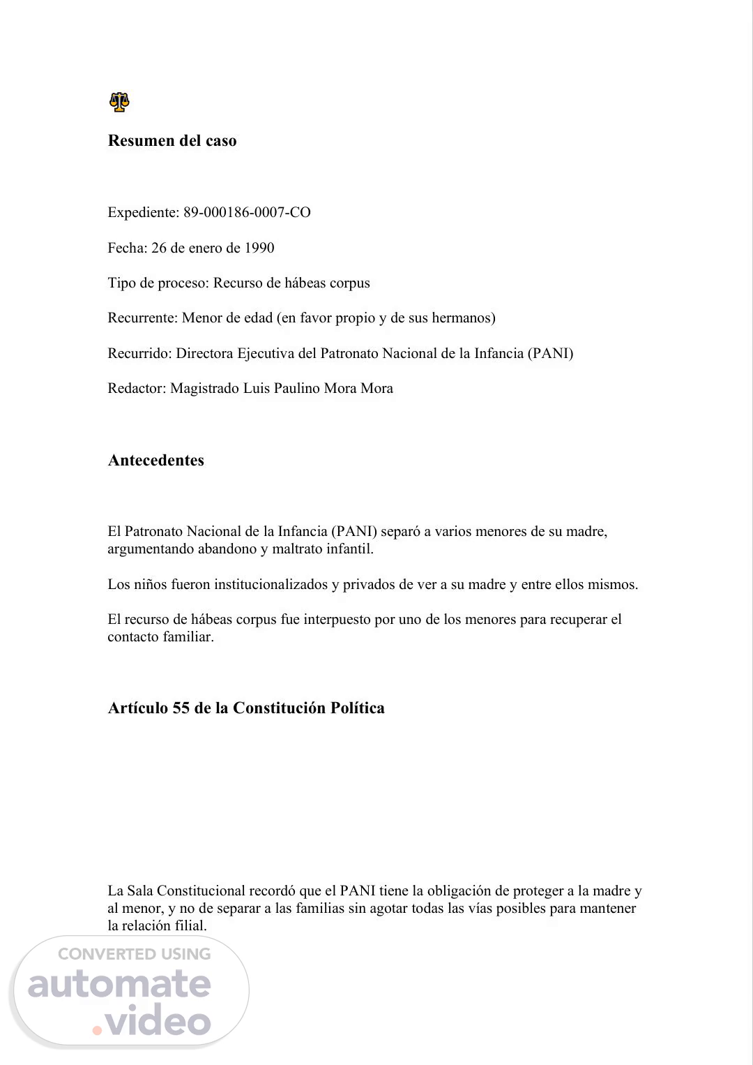 Resumen del caso Expediente: 89-000186-0007-CO Fecha: 26 de enero de 1990 Tipo de proceso: Recurso de hábeas corpus Recurrente: Menor de edad (en favor propio y de sus hermanos) Recurrido: Directora Ejecutiva del Patronato Nacional de la Infancia (PANI) Redactor: Magistrado Luis Paulino Mora Mora Antecedentes El Patronato Nacional de la Infancia (PANI) separó a varios menores de su madre, argumentando abandono y maltrato infantil. Los niños fueron institucionalizados y privados de ver a su madre y entre ellos mismos. El recurso de hábeas corpus fue interpuesto por uno de los menores para recuperar el contacto familiar. Artículo 55 de la Constitución Política “El Patronato Nacional de la Infancia es una institución con respaldo constitucional, creada para que proteja en forma especial a la madre y al menor.” La Sala Constitucional recordó que el PANI tiene la obligación de proteger a la madre y al menor, y no de separar a las familias sin agotar todas las vías posibles para mantener la relación filial..
