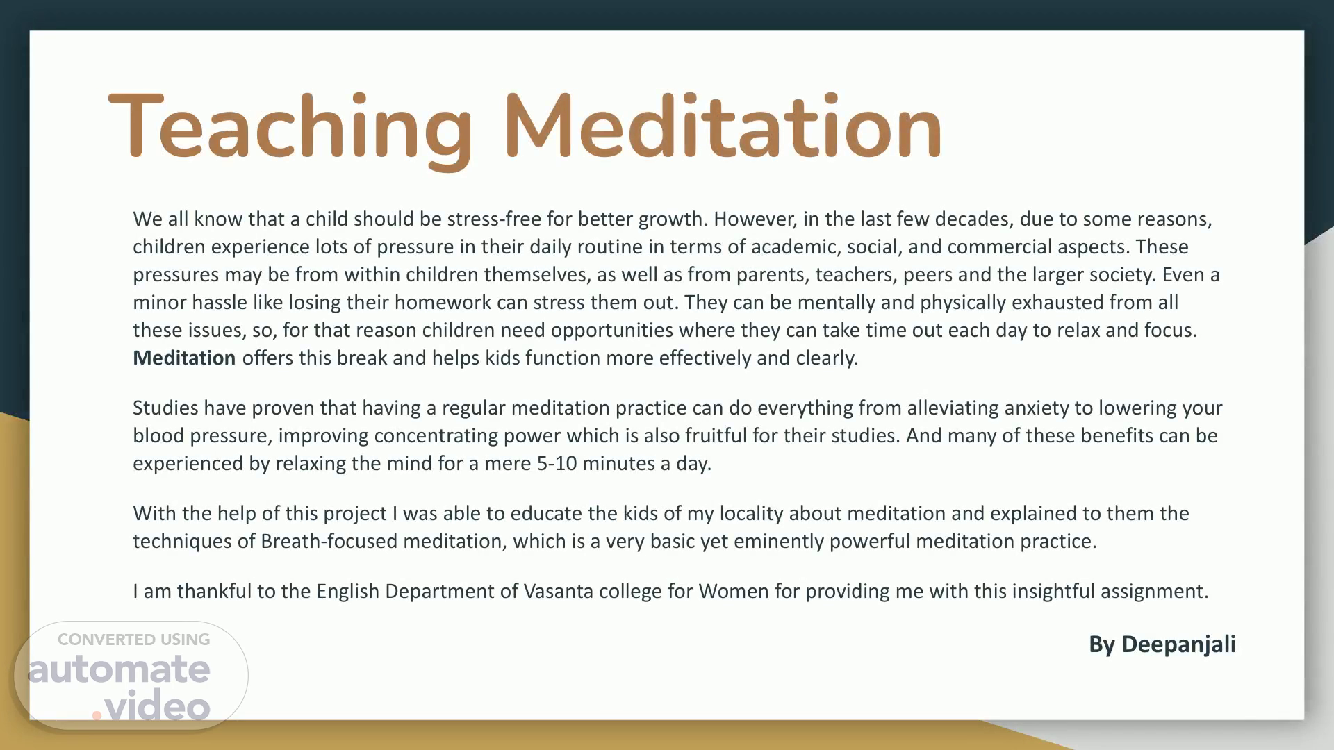 . . Teaching Meditation We all know that a child should be stress-free for better growth. However, in the last few decades, due to some reasons, children experience lots of pressure in their daily routine in terms of academic, social, and commercial aspects. These pressures may be from within children themselves, as well as from parents, teachers, peers and the larger society. Even a minor hassle like losing their homework can stress them out. They can be mentally and physically exhausted from all these issues, so, for that reason children need opportunities where they can take time out each day to relax and focus. Meditation offers this break and helps kids function more effectively and clearly. Studies have proven that having a regular meditation practice can do everything from alleviating anxiety to lowering your blood pressure, improving concentrating power which is also fruitful for their studies. And many of these benefits can be experienced by relaxing the mind for a mere 5-10 minutes a day. With the help of this project I was able to educate the kids of my locality about meditation and explained to them the techniques of Breath-focused meditation, which is a very basic yet eminently powerful meditation practice. I am thankful to the English Department of Vasanta college for Women for providing me with this insightful assignment. By Deepanjali.
