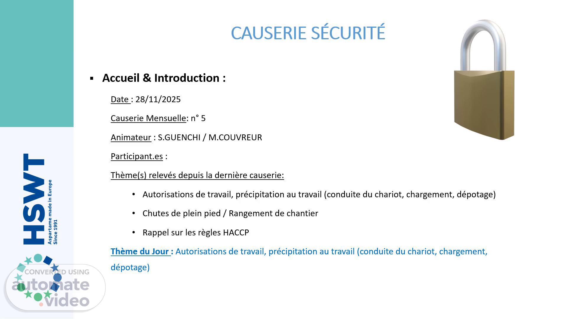 Accueil & Introduction : Date : 28/11/2025 Causerie Mensuelle: n° 5 Animateur : S.GUENCHI / M.COUVREUR Participant.es : Thème(s) relevés depuis la dernière causerie: Autorisations de travail, précipitation au travail (conduite du chariot, chargement, dépotage) Chutes de plein pied / Rangement de chantier Rappel sur les règles HACCP Thème du Jour : Autorisations de travail, précipitation au travail (conduite du chariot, chargement, dépotage).