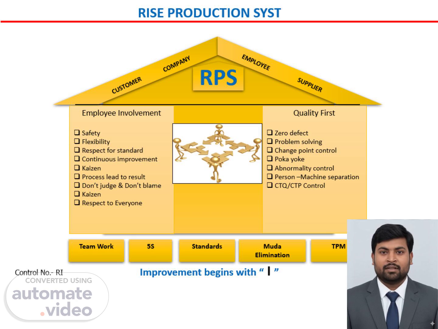 Control No.- RISE-TRM-01. Team Work 5S Standards Muda Elimination TPM CUSTOMER COMPANY Employee Involvement Safety Flexibility Respect for standard Continuous improvement Kaizen Process lead to result Don’t judge & Don’t blame Kaizen Respect to Everyone RPS Quality First Zero defect Problem solving Change point control Poka yoke Abnormality control Person –Machine separation CTQ/CTP Control Improvement begins with “ I ” EMPLOYEE SUPPLIER.