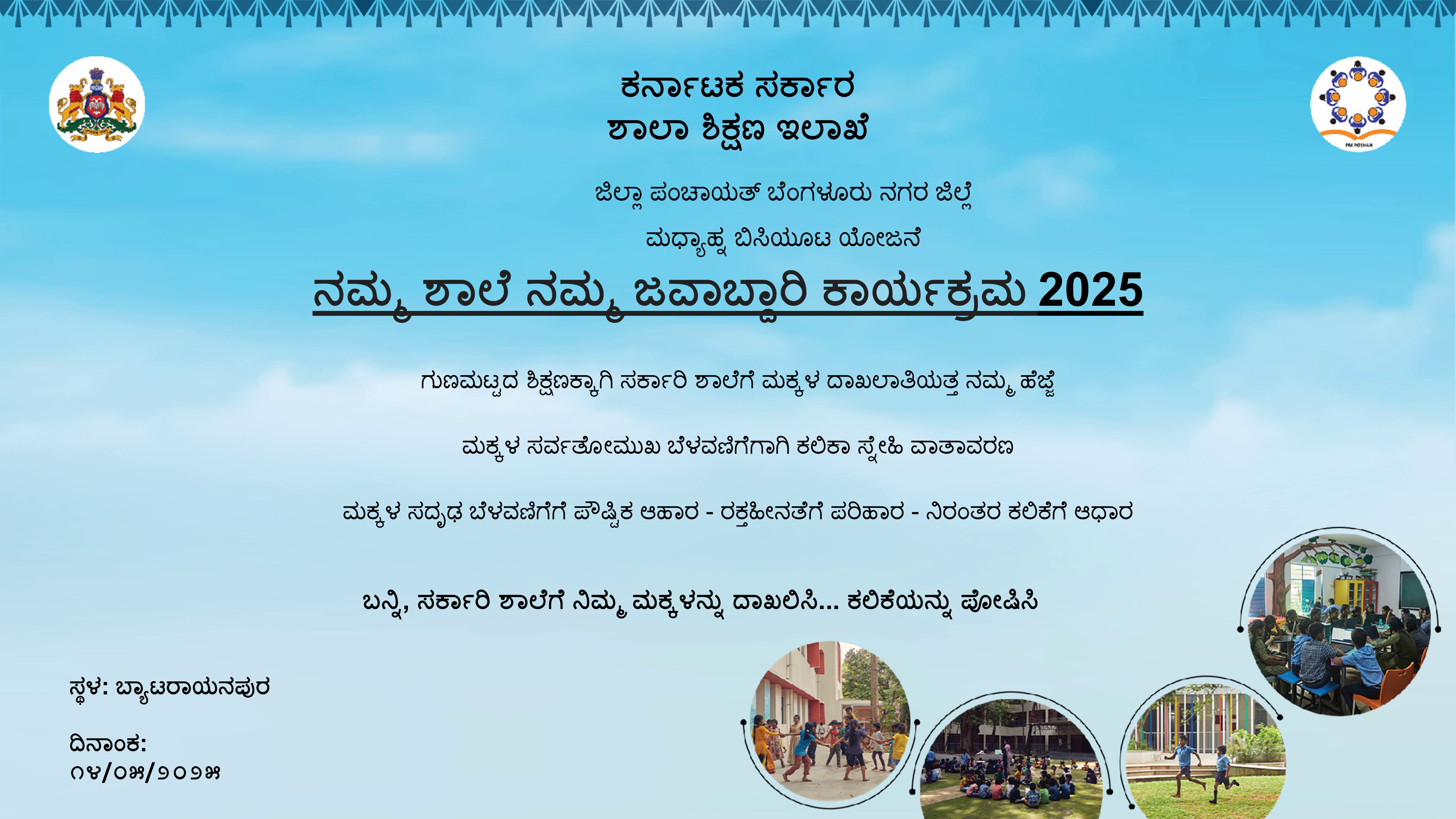 [Audio] "ಅನೇಕರು ಸ್ವತಃ ಮೂಲಕ್ಷೇಮಿಸಲು ಪ್ರಯತ್ನಿಸಲು ಪ್ರೇರಿತರಾಗಿದ್ದಾರೆ, ಈ ಜಿಲ್ಲೆಯ ಬೀಡಾದ ಮಕ್ಕಳಿಗೆ ಗ್ರಾಮದ ಜೀವನವನ್ನು ಬೆಳೆಸಲು ಮತ್ತು ಸಮಾಜದ ಉನ್ನತಿಗೆ ಸಹಾಯ ಮಾಡಲು ಜಿಲ್ಲಾ ಪಂಚಾಯತ್ ಬೆಂಗಳೂರು ನಗರ ಜಿಲ್ಲೆಯ ಮಧ್ಯಾಹ್ನ ಬಿಸಿಯೂಟ ಯೋಜನೆ ನಡೆಸಲಾಗುತ್ತಿದೆ. ಇದರ ಉದ್ದೇಶವೆಂದರೆ ಜಿಲ್ಲೆಯಲ್ಲಿರುವ ಬಡ ಮಕ್ಕಳಿಗೆ ಶಿಕ್ಷಣ ಮತ್ತು ಉದ್ಯೋಗ ಅವಕಾಶಗಳನ್ನು ಒದಗಿಸುವುದು. ಈ ಯೋಜನೆ ೧೪/೦೫/೨೦೨೫ ದಿನಾಂಕದಂದು ಬ್ಯಾಟರಾಯನಪುರದಲ್ಲಿ ನಡೆಯುತ್ತಿರುವುದು. ಇದು ನಾನಗೆ ಅತ್ಯಂತ ಹೆಮ್ಮೆಯ ಸಂಗತಿ. ಇದರ ಮೂಲಕ ಸ್ಥಳದಲ್ಲಿ ಇತರ ಮತ್ತು ಆಂತರಿಕ ವಿದ್ಯಾರ್ಥಿ ವಿಜ್ಞಾನ ಮತ್ತು ತಂತ್ರಜ್ಞಾನ ಪ್ರದರ್ಶನದ ಮೂಲಕ ಹಿನ್ನೆಲೆ ಸಂಪರ್ಕವನ್ನು ಸಂಪಾದಿಸಲಾಗುತ್ತಿದೆ..