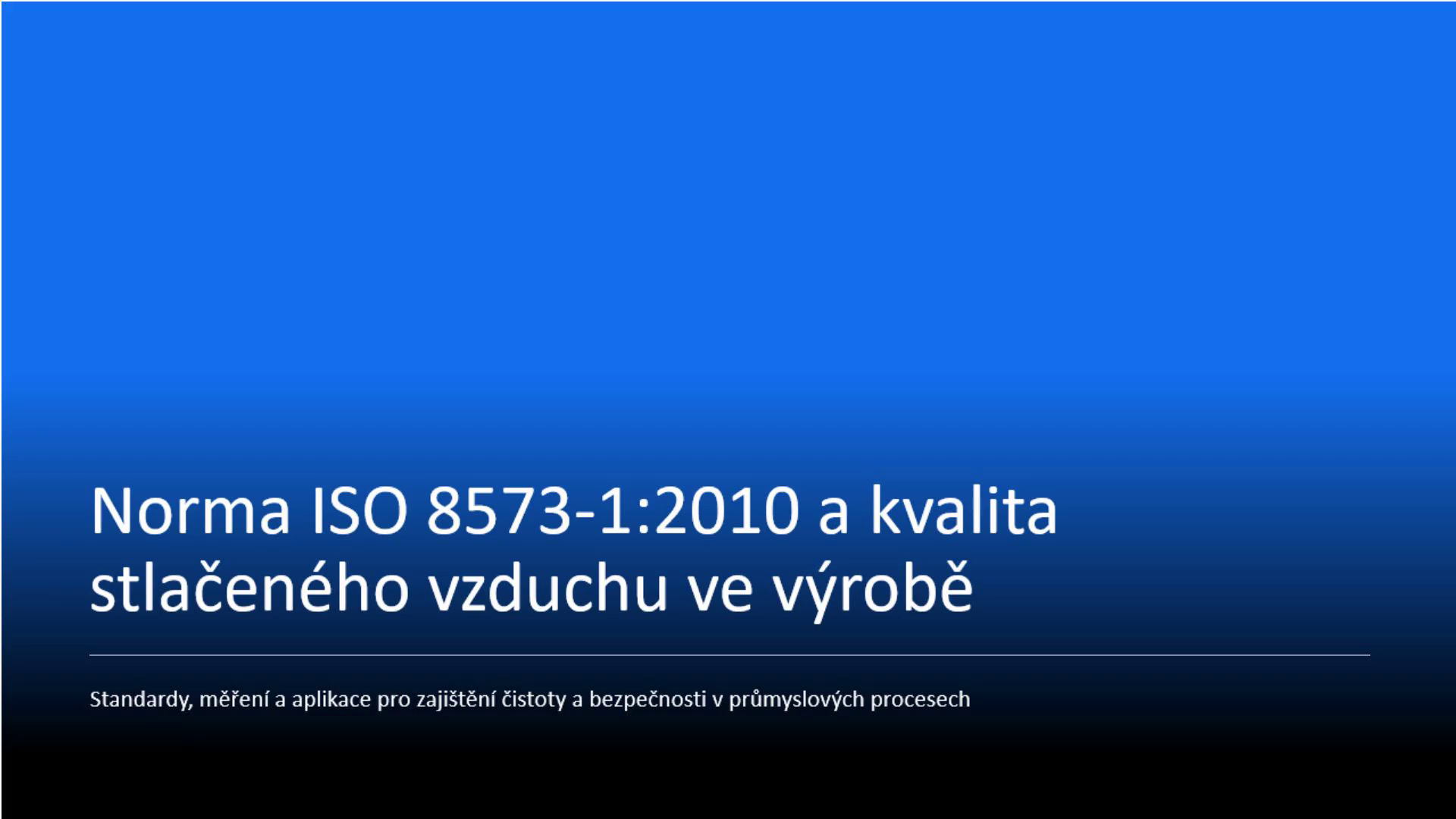 [Audio] Norma ISO 8573-1:2010 je mezinárodním standardem, který stanovuje požadavky na kvalitu stlačeného vzduchu používaného ve výrobních procesech. Zaměřuje se především na definici tříd čistoty vzduchu podle obsahu pevných částic, vody a oleje. Tato norma hraje klíčovou roli v průmyslových odvětvích, jako jsou potravinářství, kosmetika a farmacie, kde je nezbytné zajistit, aby stlačený vzduch neovlivnil negativně kvalitu výrobků ani bezpečnost procesů. Dodržování normy pomáhá minimalizovat riziko kontaminace a zároveň zvyšuje spolehlivost výrobních systémů, což vede k vyšší efektivitě a bezpečnosti výroby..