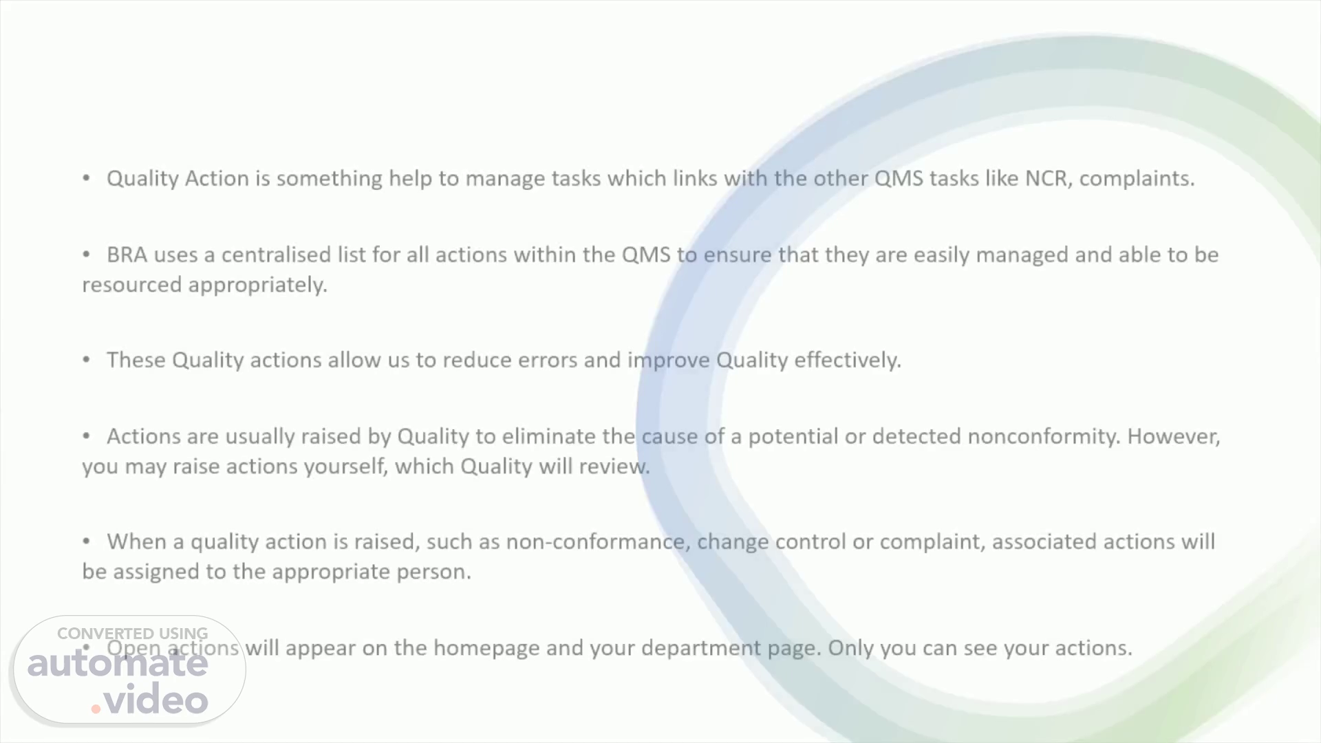 [Audio] Let's move to know about quality Action Quality Action is something help to manage tasks which links with the other QMS tasks like NCR, complaints. BRA uses a centralised list for all actions within the QMS to ensure that they are easily managed and able to be resourced appropriately. These Quality actions allow us to reduce errors and improve Quality effectively. Actions are usually raised by Quality to eliminate the cause of a potential or detected nonconformity. However, you may raise actions yourself, which Quality will review. When a quality action is raised, such as non-conformance, change control or complaint, associated actions will be assigned to the appropriate person. Open actions will appear on the homepage and your department page. Only you can see your actions..