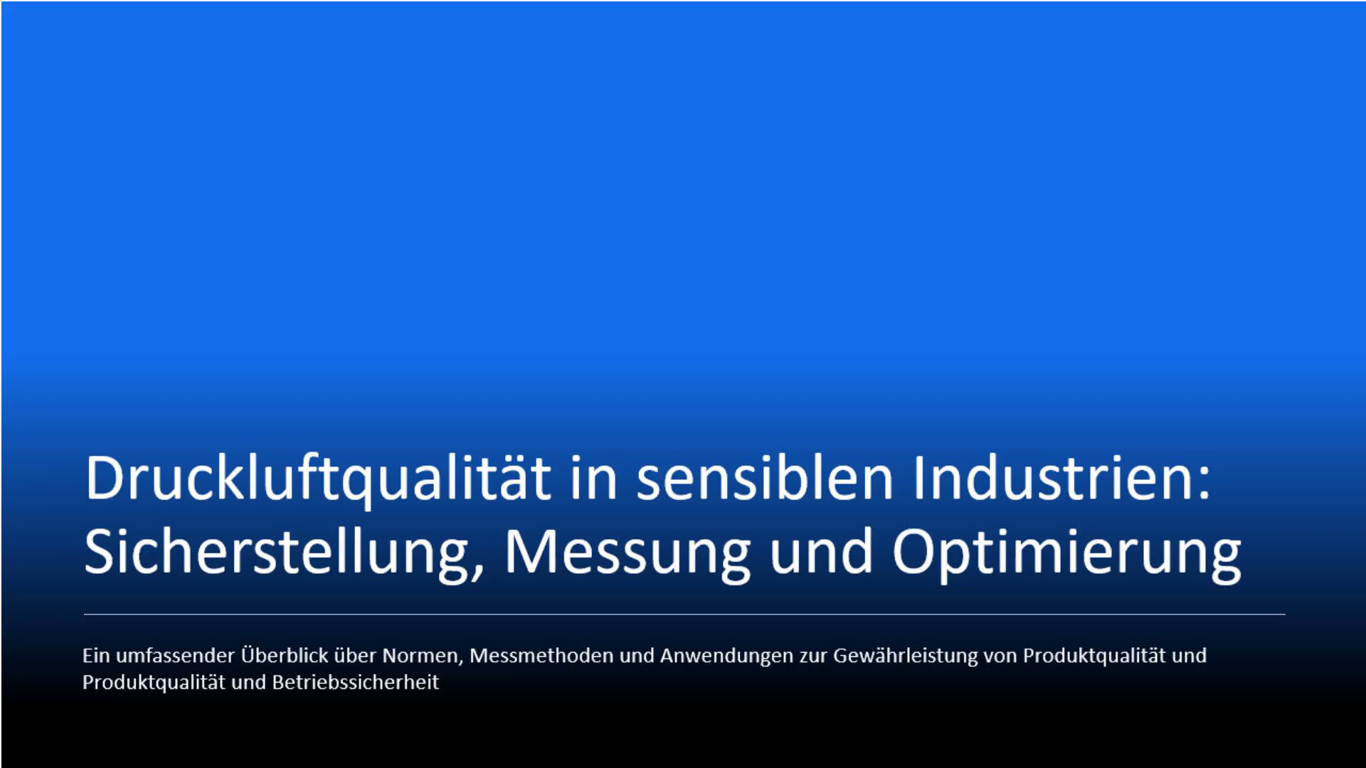 [Audio] In dieser Präsentation werden wir uns zunächst mit der Bedeutung der Druckluftqualität beschäftigen, insbesondere für Produktionsunternehmen in den Branchen Lebensmittel, Kosmetik und Pharma. Anschließend definieren wir, welche Faktoren die Druckluftqualität beeinflussen. Wir erläutern die Norm ISO 8573-1, die Reinheitsklassen für Druckluft festlegt. Danach stellen wir verschiedene Messmethoden vor, wie die Partikelzählung und Restölmessung, und vergleichen stationäre und mobile Messgeräte hinsichtlich ihrer Vor- und Nachteile. Ein weiterer Schwerpunkt liegt auf der regelmäßigen Überprüfung und Dokumentation der Druckluftqualität. Wir zeigen spezifische Anwendungen in sensiblen Industrien auf und erklären, wie durch kontinuierliche Messung Druckluftsysteme optimiert werden können. Abschließend betrachten wir die langfristigen Vorteile einer hohen Druckluftqualität für Produktqualität, Betriebskosten und Anlagensicherheit..