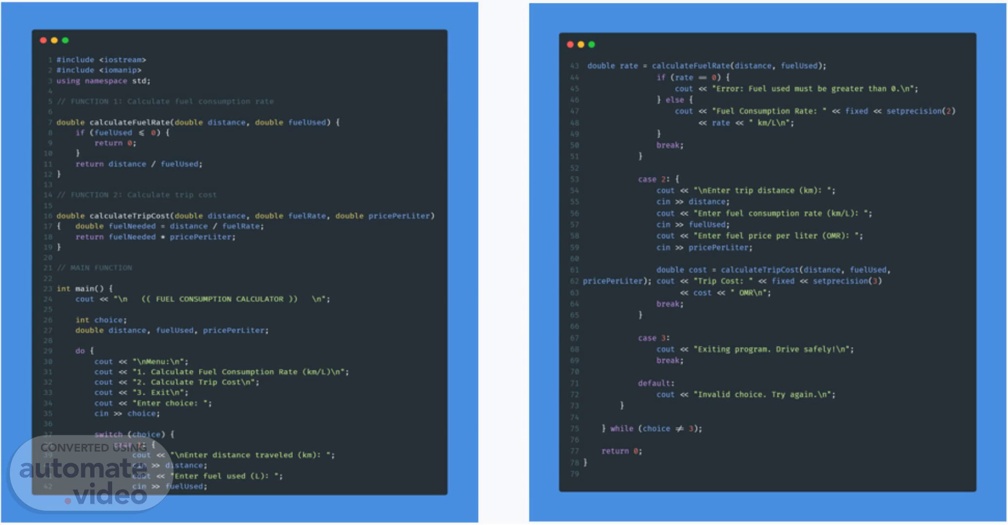 t *include < iostrean» *include using namespace Std; eovbte calculatevuetgate«ovble return o; return distance / fuetused; doubte calculatetripcost(dovble double rate calculateFuelRate(distance. fuelused); distance. distance. double double fuerused) fuergate. (rate cout ) else ( cout break ; cout •Error: Fuet used oust be greater than e. Nn • ; : • fixed setprecision(2) •suet consu•pticn gate rate « • •SnEnter trip distamce • ' double pricePerti ter) double fue1NeeOed • distance / f ver Rate; return fuetNeeeed • pricePerLiter; v pncepertiter); int nain() COUt • Nn int choice; FUEL COWAPTION CALCULATOR cin distance; cout •Enter Cuet consu.ption rate (knit): • Cin fuelused; cout •enter fuel price per titer • ; cin pricePerLiter; double cost • calculaternpcost(distance. foetused. cout •vriP Cost: • fixed setpreciston(3) cost • tm•sn•; break; doubte distance. luetused, prtcePerLiter; do cout « cout « cout cout cout •t. Calculate • 2. Calculate Trip •3. EXit\n•; •tnter choice: • Consunpt i on Cost Xn' ; Rate case 3: cout break; default: cout •Exiting progran. •Invalid choice. oriv• safetyt\n•; try againe\n•; cin choice; switch (choice) case 1 : cout •xnfnter distance traveled (En): • Cin distance; cout •enter fuel used • fuel used; ) shite (choice J); return e;.