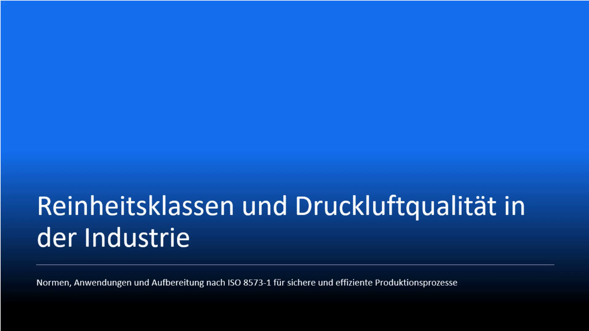 [Audio] Reinheitsklassen sind ein standardisiertes System zur Klassifizierung der Qualität von Druckluft, basierend auf der Konzentration von Feststoffpartikeln, Wasser und Öl. Diese Klassen werden gemäß der ISO 8573-1 Norm definiert, um sicherzustellen, dass die Druckluft den Anforderungen verschiedener Anwendungen entspricht. Da Druckluft von Natur aus Verunreinigungen enthält, legen die Reinheitsklassen die maximal zulässigen Konzentrationen dieser Stoffe fest. Dadurch können Anwender die notwendige Aufbereitung der Druckluft genau planen, was die Leistungsfähigkeit und Lebensdauer ihrer pneumatischen Systeme verbessert..