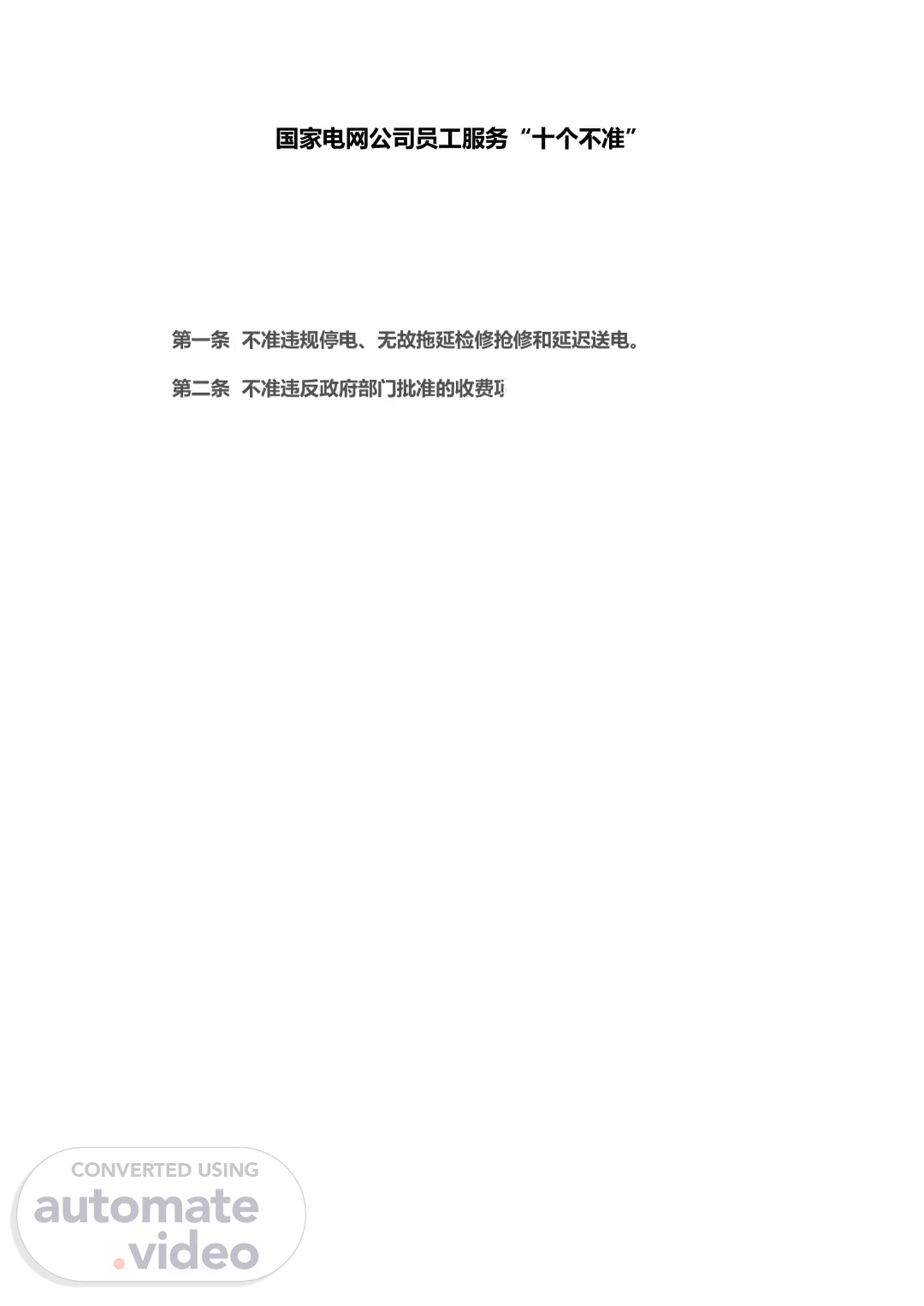 . . 国家电网公司员工服务“十个不准”. 第一条 不准违规停电、无故拖延检修抢修和延迟送电。. 第二条 不准违反政府部门批准的收费项目和标准向客户收费。.