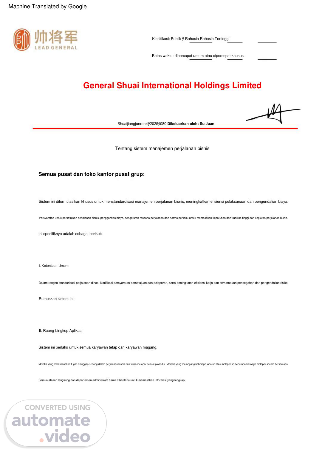 Pengiriman utama: berbagai pusat dan toko Kata kunci: sistem perjalanan bisnis Ditangani oleh: Pusat Sumber Daya Manusia (Administrasi) Pengulas: Su Juan Ditulis oleh: Chen Cuiyi 27 Juli 2025 (Halaman ini tidak memiliki teks) General Shuai International Holdings Limited Machine Translated by Google.