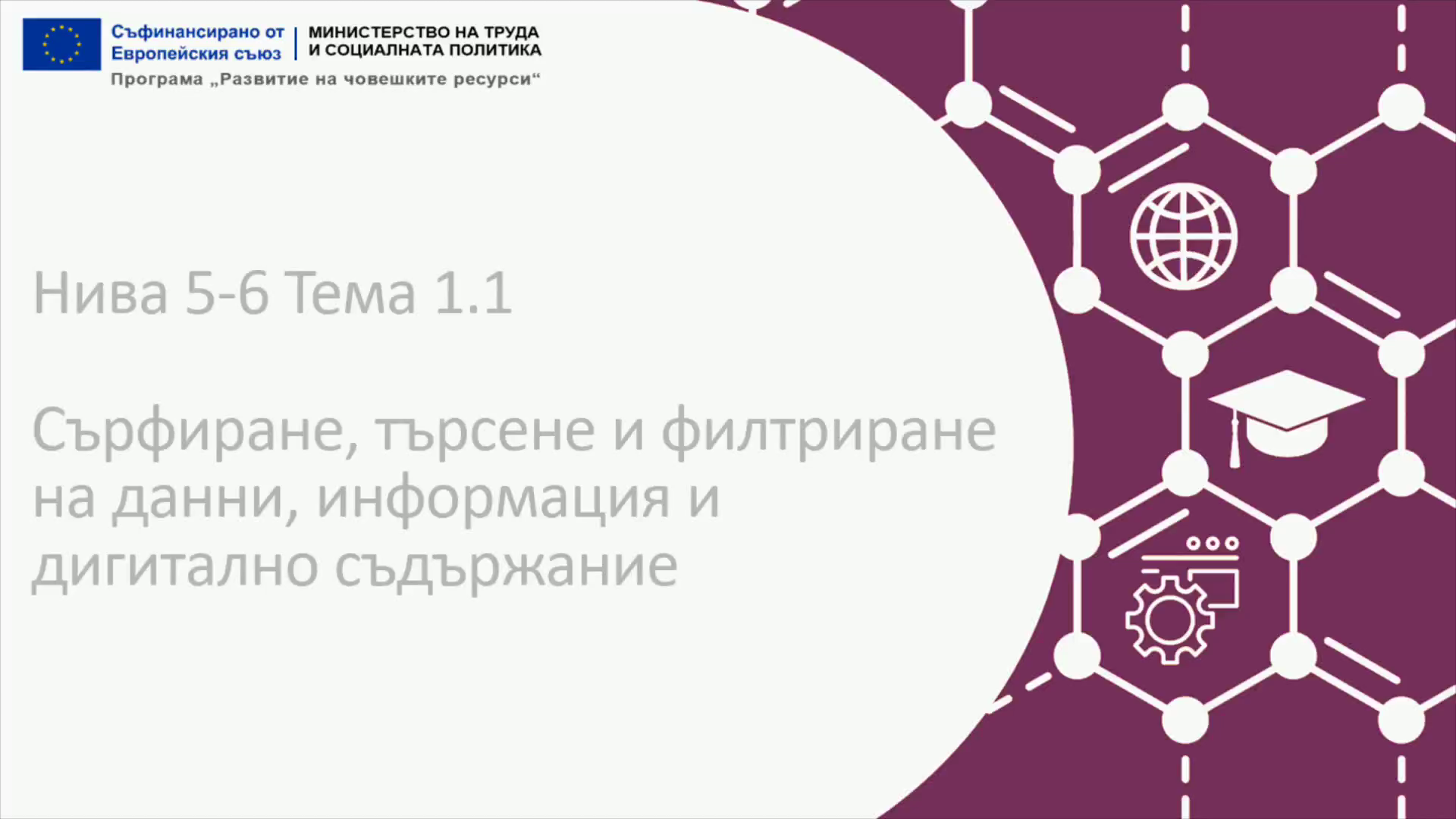 [Audio] Мултимедийна презентация за Нива 5-6, по Тема 1.1 Сърфиране, търсене и филтриране на данни, информация и дигитално съдържание От Европейска Рамка на дигиталните компетентности с петте области на дигитална компетентност и 21 дигитални умения/ компетентности (DigComp 2.1) По програма "Развитие на човешките ресурси" към Министерството на труда и социалната политика, съфинансирана от Европейския съюз..