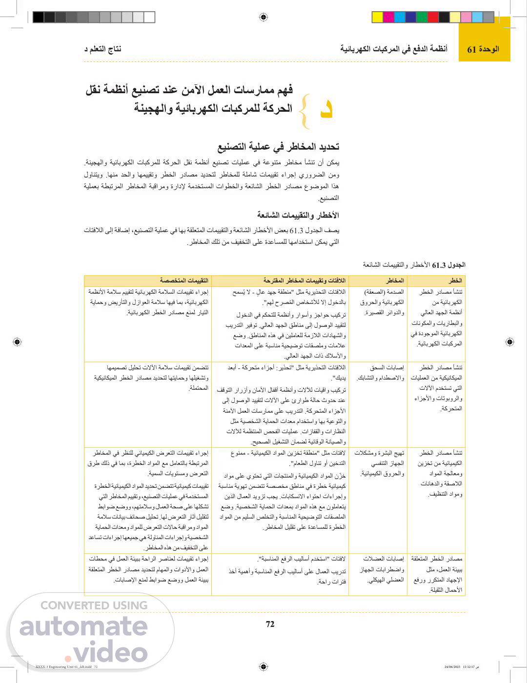 61 ةدحولاةيئابرهكلا تابكرملا يف عفدلا ةمظنأ د ملعتلا جاتن 73 رطخلارطاخملاةحرتقملا رطاخملا تامييقتو تاتفلالاةصصختملا تامييقتلا رطخلا رداصم أشنت ماحللا نم ةيرارحلا ريدصقلاب ماحللاو دلوت يتلا تايلمعلاو .عاعشلإاو ةرارحلا قئارحلاو قورحلا ةطبترملا تاباصلإاو .ةرارحلاب ."ةرارحلل ةمواقم تازافق ِدترا - نخاس حطس" تاتفلا عنمل ةيريذحت تاتفلاو لزاوعو ةيرارح زجاوح بيكرت لثم ةيصخشلا ةيامحلا تادعم ريفوت .ةيضرعلا قورحلا ةئفدتلا ةمظنأ ريفوت .ةرارحلل ةمواقملا تازافقلاو سبلاملا .لامعلا يف ريثأتلا ليلقتل ديربتلاو ءاضوضلا رطاخم أشنت تادعملاو تلالآا نم .ةيئابرهكلا تاودلأاو تلاكشمو عمسلا نادقف .عمسلا ."نذلأا تادادس عض - عمسلا ةيامح بجي" تاتفلا ،ةيلاعلا ءاضوضلا قطانم ديدحتل ءاضوضلا تامييقت .تايواحلاو يتوصلا لزعلا لثم ءاضوضلل طباوض عضوو ،عمسلا تايقاو لثم ةيصخشلا ةيامحلا تادعم ريفوتو .ةليوط تارتفل ءاضوضلل ضرعتلا عنمل لامعلا بوانتو تايوتسم رارمتساب ءاضوضلل ضرعتلا تامييقت بقارُت ردصم ددحتو ،عينصت ةيلمع لك يف ءاضوضلا ةيامحلا تادعمل لامعلا تاجايتحا مّيقتو ءاضوضلا رطاخم ليلقتل ،اهريغو نذلأا تايقاو لثم ،ةيصخشلا .ىرخلأا رارضلأاو عمسلا نادقف ريكفتلل ةفقو تابكرملل ةكرحلا لقن ةمظنأ عينصتب ةطبترملا ةسيئرلا رطاخملا عاونأ ام نم فيفختلل اهعضو نكمي يتلا مكحتلا طباوض امو ،ةنيجهلاو ةيئابرهكلا ؟رطاخملا هذه حيملت ةيرارحلاو ةيكيناكيملاو ةيئايميكلاو ةيئابرهكلا رطخلا رداصم يف رّكف .عينصتلا تايلمع يف لمعلا ةئيبب ةطبترملاو ءاضوضلاو قفلأا عيسوت ةملاسلاو ةءافكلا يف ةمدقتملا ةملاسلا تلاوكوتورب قيبطت رثؤي فيك ؟عينصتلا ةيلمعل ةماعلا ةيدرفلا تايلمعلا ليلحت ،ةدح ىلع ةيعينصت ةمهم وأ ةيلمع لك ةيدرفلا تايلمعلا ليلحت لوانتي .اهنم فيفختلا ىلع ةدعاسملل ةيباقر ريبادت عضول رطخلا رداصم ددحيو داوملا ةلوانمو تاودلأا مادختساو تلالآاو تادعملا ليلحت كلذ نمضتيو .ةنملآا لمعلا تاسرامم عابتا نامضل عينصتلا يف ةعئاشلا رطخلا رداصم تاتفلا حضوملا وحنلا ىلع عينصتلا يف رطخلا رداصم تاتفلا مادختسا عيشي رذحلا تابلطتم وأ رطخلا لئاسر وأ تاريذحتلا حيضوتل مدختسُت يهف .هاندأ تاتفلا ىلع ةرظن يقلنس ،61.4 لودجلا يف .مهفلا ةلهس ةقيرطب نيلماعلل .عينصتلا يف اًعويش رثكلأا رطخلا رداصم �يعامجلا لمعلا �ةيلوؤسملا تاراهملا .ماحللا ◀ XXXX-3 Engineering Unit 61_AR.indd 73 XXXX-3 Engineering Unit 61_AR.indd 73 24/06/2025 11:12:18 ص24/06/2025 11:12:18 ص.