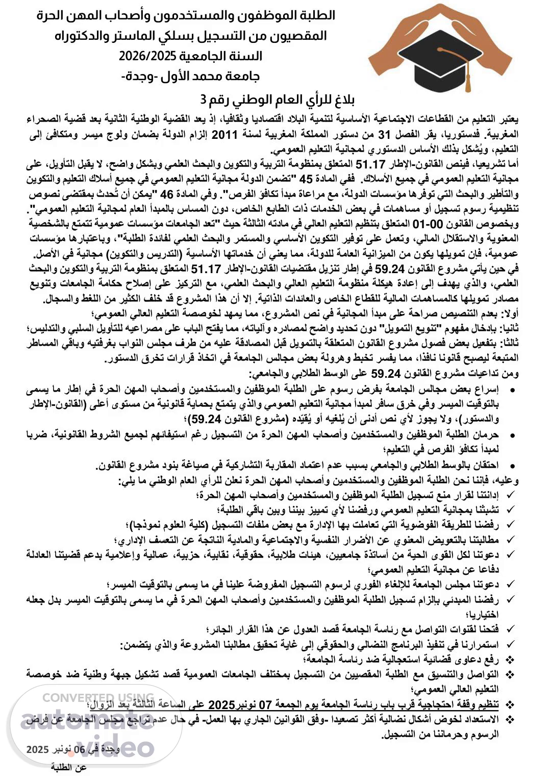 نوفظوملا ةبلطلا نومدختسملاووأنهملا باحص ةرحلا رتساملا كيلسب ليجستلا نم نويصقملاهاروتكدلاو ةيعماجلا ةنسلا2025/2026 لولأا دمحم ةعماج-دجوة- أرلل غلابي مقر ينطولا ماعلا 3 بلطلا نعة ايداصتقا دلابلا ةيمنتل ةيساسلأا ةيعامتجلاا تاعاطقلا نم ميلعتلا ربتعيايفاقثو، ذإ دعي ةيناثلا ةينطولا ةيضقلا عب ءارحصلا ةيضق د .ةيبرغملا ف ،ايروتسد لصفلا رقي31 ةنسل ةيبرغملا ةكلمملا روتسد نم2011 مازلإ ةلودلا نامضب جولو رسيم وئفاكتم ىلإ ،ميلعتلا لكشُيو كلذب ساسلأا يروتسدلا ةيناجمل ميلعتلا يمومعلا. ،ايعيرشت امأ فيصن انوناقل-راطلإا 51.17 قلعتملا ةموظنمب ةيبرتلا نيوكتلاو ثحبلاو ملعلا يولكشب حضاو لبقي لا ،،ليوأتلا ىلع ةيناجم ميلعتلا يمومعلا يف عيمج كلاسلأا . يفف ةداملا45 " نيوكتلاو ميلعتلا كلاسأ عيمج يف يمومعلا ميلعتلا ةيناجم ةلودلا نمضت ودلا تاسسؤم اهرفوت يتلا ثحبلاو ريطأتلاواكت أدبم ةاعارم عم ،ةلصرفلا ؤف" .ةداملا يفو 46 "نكمي نأ ثدحُت ىضتقمب صوصن ةيميظنت موسر ليجست وأ تامهاسم يف ضعب تامدخلا تاذ عباطلا ،صاخلا نود ساسملا أدبملاب ماعلا ةيناجمل ميلعتلا ومعلايم". نوناقلا صوصخبو 01-00 قلعتملا ميظنتب ميلعتلا يلاعلا ةثلاثلا هتدام يف ثيح "دعت تاعماجلا تاسسؤم ةيمومع عتمتت ةيصخشلاب ةيونعملا وللاقتسلاا ،يلاملا لمعتو ىلع ريفوت نيوكتلا يساسلأا رمتسملاو ثحبلاو يملعلا ةدئافل ةبلطلا ،"اهرابتعابو تاسسؤم ،ةيمومع نإف اهليومت نوكي نم ةينازيملا ةماعلا ،ةلودلل امم ينعي نأ اهتامدخ ةيساسلأا (سيردتلا نيوكتلاو )ةيناجم يف لصلأا. نيح يف يتأيعورشم نوناقلا 59.24 يف راطإ ليزنت تايضتقم نوناقلا-راطلإا 51.17 قلعتملا ةموظنمب ةيبرتلا نيوكتلاو ثحبلاو ،يملعلا و يذلافدهي ىلإ ةداعإ ةلكيه ةموظنم ميلعتلا يلاعلا ثحبلاو ،يملعلا عم زيكرتلا ىلع حلاصإ ةماكح تاعماجلا عيونتو رداصم اهليومت اكتامهاسمل ةيلاملا عاطقلل صاخلا تادئاعلاو ةيتاذلا . اذه نأ لاإلادق عورشم طغللا نم ريثكلا فلخلاجسلاو. لاوأ : مدعبصيصنتلا ةحارص ىلع أدبم ةيناجملا يف صن عورشملايمومعلا يلاعلا ميلعتلا ةصصوخل دهمي امم ،؛ يناثب :الاخدإ وهفم" معيونت ليومتلا "نود ديدحت حضاو هرداصمل هتايلآو، بابلا حتفي امم هيعارصم ىلع ليوأتلل يبلسلا سيلدتلاو؛ ثلاث :ابنوناقلا عورشم لوصف ضعب ليعفت ليومتلاب ةقلعتملا باونلا سلجم فرط نم هيلع ةقداصملا لبق هيتفرغب بورطاسملا يقا صيل ةعبتملا ،اذفان انوناق حبرسفي امم طبختةلورهو سلاجم ضعبيف ةعماجلا .روتسدلا قرخت تارارق ذاختا تايعادت نمو عورشم نوناقلا 59.24 يبلاطلا طسولا ىلعيعماجلاو: عارسإ ضعب ةعماجلا سلاجم ب ضرف نيفظوملا ةبلطلا ىلع موسر نيمدختسملاونهملا باحصأو ةرحلا راطإ يف ىمسي ام برسيملا تيقوتلا وقرخ يف رفاسلأدبم ةيناجم ميلعتلا يمومعلا يذلاوعتمتي ةيامحب قةينونا نم ىوتسم ىلعأ (نوناقلا-راطلإا روتسدلاو)، لاو زوجي يلأ صن ىندأ نأ هيغلُي وأ هدّيقُي (عورشم نوناقلا 59.24)؛ نامرحنيمدختسملاو نيفظوملا ةبلطلا نهملا باحصأو ةرحلا ليجستلا نم ةينوناقلا طورشلا عيمجل مهئافيتسا مغرض ، ابر ميلعتلا يف صرفلا ؤفاكت أدبمل؛ يبلاطلا طسولاب ناقتحاببسب يعماجلاو دعم ةيكراشتلا ةبراقملا دامتعا نوناقلا عورشم دونب ةغايص يف. نإف ،هيلعوان نحن ايفظوملا ةبلطل ن نيمدختسملاونهملا باحصأو ةرحلا ينطولا ماعلا يأرلل نلعن يلي ام: تنادإان نيمدختسملاو نيفظوملا ةبلطلا ليجست عنم رارقل نهملا باحصأو ةرحلا؛ ثبشتان ضفرو يمومعلا ميلعتلا ةيناجمبان يلأ نيب زييمتان ؛ةبلطلا يقاب نيبو ضفران اهب تلماعت يتلا ةيوضوفلا ةقيرطللةرادلإا عم ضعب ليجستلا تافلم )اجذومن مولعلا ةيلك(؛ تبلاطمان نع يونعملا ضيوعتلابرارضلأا ةيسفنلاةيعامتجلااو فسعتلا نع ةجتانلا ةيداملاويرادلإا؛ توعدان لنم ةيحلا ىوقلا لك ةيبلاط تائيه ،نييعماج ةذتاسأ، ةيقوقح ،ةيباقن ،يبزحة ،لامعةي معدب ةيملاعإو تيضقنا ةلداعلا افدم نع اعةيناج يمومعلا ميلعتلا؛ انتوعد ةعماجلا سلجم للا ليجستلا موسرل يروفلا ءاغللإانيلع ةضورفم يف رسيملا تي