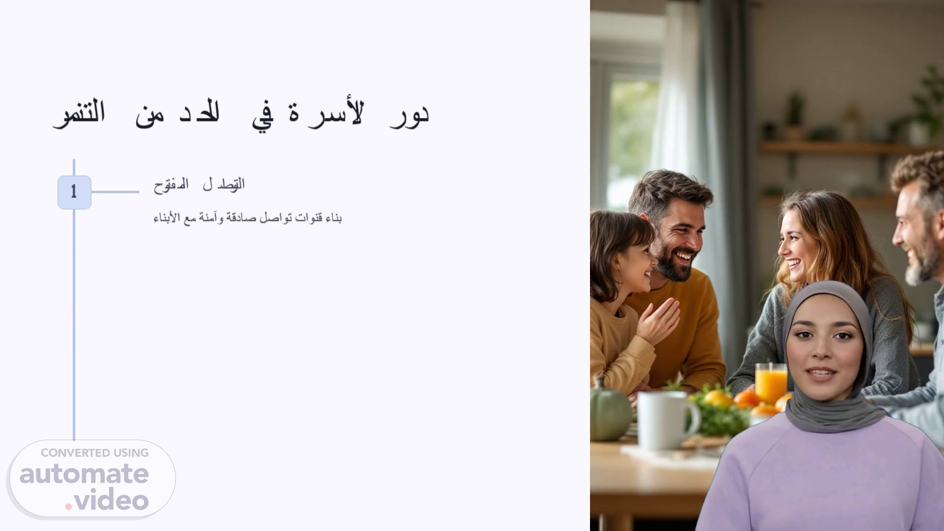 [Virtual Presenter] مرحبا وأهلا بكم في العرض التدريبي الخاص بنا حول دور الأسرة في منع التنمر. نتحدث عن كيفية إنشاء قنوات اتصال صادقة وآمنة مع الأطفال، وتعزيز القيم وغرس قيم الاحترام، التسامح، والتعاطف. كما نتحدث عن مراقبة سلوك الأطفال وتقديم الدعم العاطفي. دعونا نبدأ!.