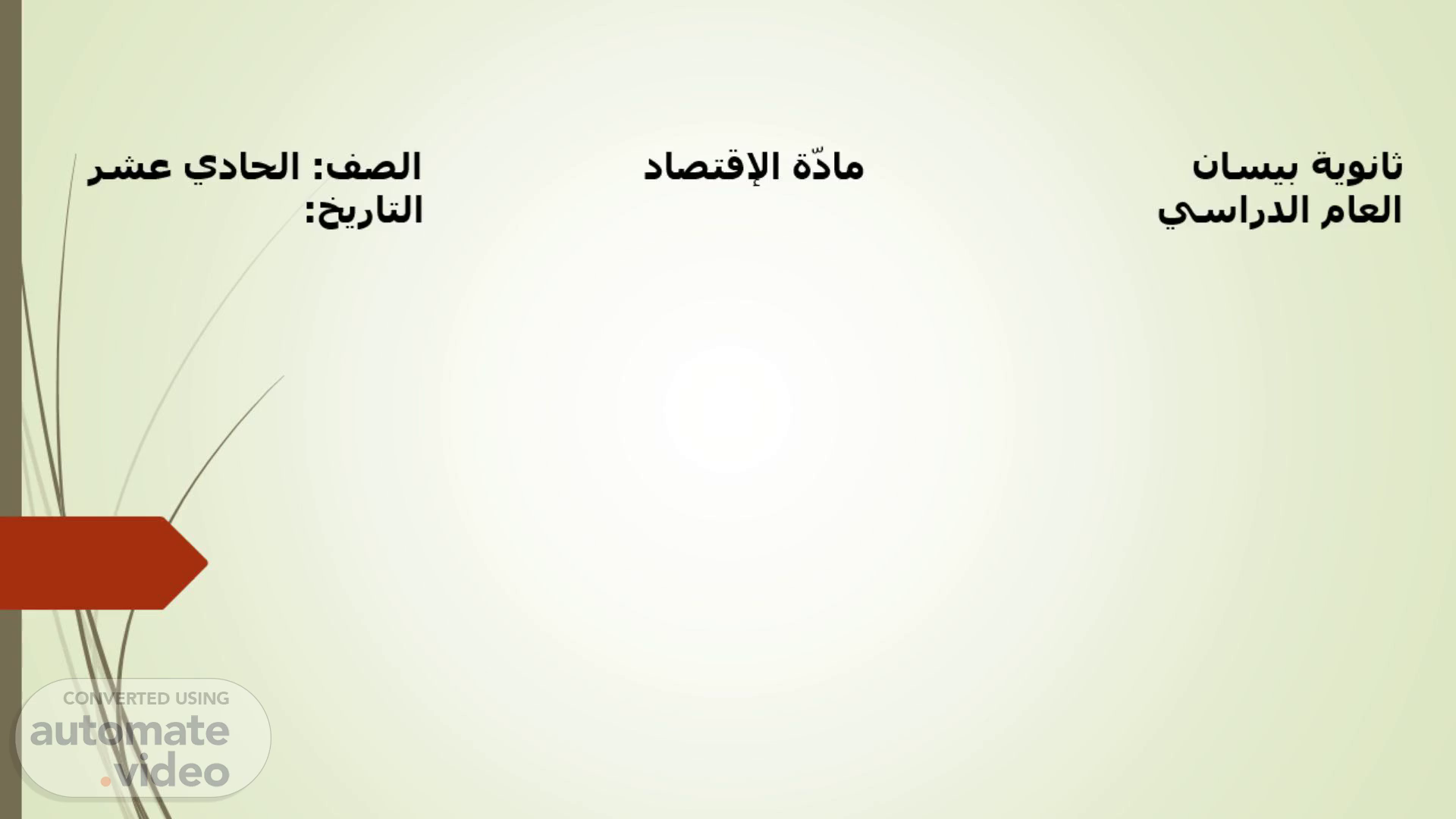 [Audio] "مرحبا وأهلا بكم في درسنا اليوم، الصف الحادي عشر في مادة الاقتصاد. نحن الآن في ثانوية بيسان وسنتعرف خلال هذه السلسلة على مفاهيم ومصطلحات اقتصادية. سنتعلم كيفية فهم وتحليل الاقتصاد وكيفية التعامل مع المصطلحات الاقتصادية المختلفة. هذا الدرس سيساعدنا في فهم العالم من منظور اقتصادي وتطبيق ما نتعلمه على حياتنا اليومية. لنبدأ درسنا ونستكشف عالم الاقتصاد معا. لا تنسوا متابعة الحلقات القادمة..