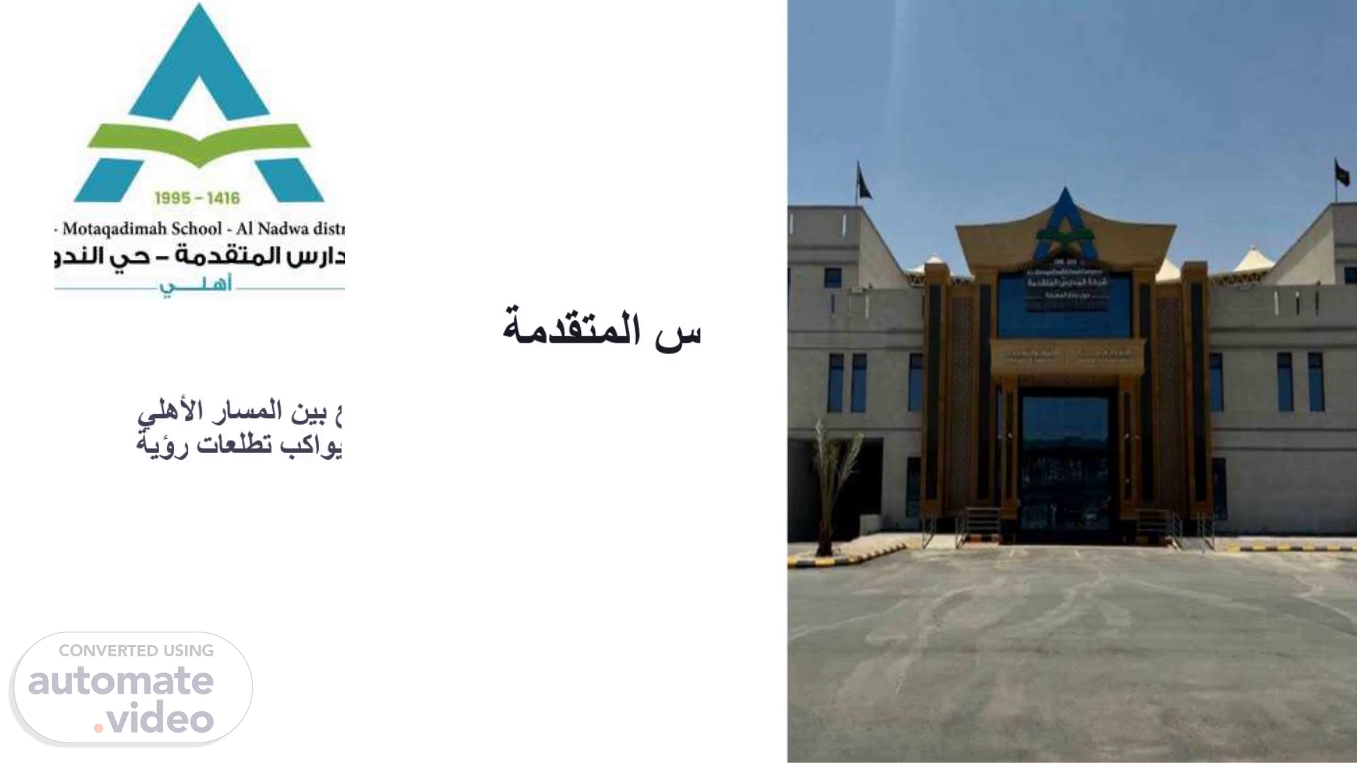 [Audio] يركز العرض التقديمي الحالي على الشريحة رقم 12 من أصل 13، وهذه الشريحة تتحدث عن إحدى أهم مؤسسات التعليم الرائدة في حي الندوة، وهي مدارس المتقدمة. تجمع هذه المؤسسة بين المسار الأهلي والمسار ثنائي اللغة، وتقدم تعليما متميزا يتوافق مع رؤية المملكة 2030 في المنطقة الوسطى. لنتعرف على نجاحات المدرسة، فتضمنت الشريحة الحالية مجموعة من الإنجازات الرائعة والنتائج المميزة التي حققها طلابنا في الاختبارات النهائية بنسب تفوق استثنائية تتراوح بين 95% - 99%. هذا يدل على جهود فريق المدرسة وطلابها والإدارة في تحقيق أهدافها المميزة في التعليم. كما قامت المدرسة بتنظيم العديد من الأنشطة والفعاليات الهامة في المجتمع المحلي، والتي تشجع طلابنا على المشاركة الفعالة وتعزز قيم التعاون والمساواة. كما شاركت المدرسة في معارض متنوعة وتميزت بمشاركتها المميزة والفعالة. نختم بهذا الشريحة اليوم ونسجل أن كل هذه الإنجازات تعود إلى فريق المدرسة وطلابها الأعزاء ودعم وتشجيع أهالينا الكرام. نسعى دائما لتوفير بيئة تعليمية متميزة ومناسبة لطلابنا، تلبي تطلعات رؤية المملكة 2030 وتساهم في بناء مجتمع أفضل ومتقدم. شكرا لاهتمامكم ومتابعتكم، ونتطلع للتواصل معكم في الشريحة الأخيرة من عرضنا المميز. شكرا لكم..