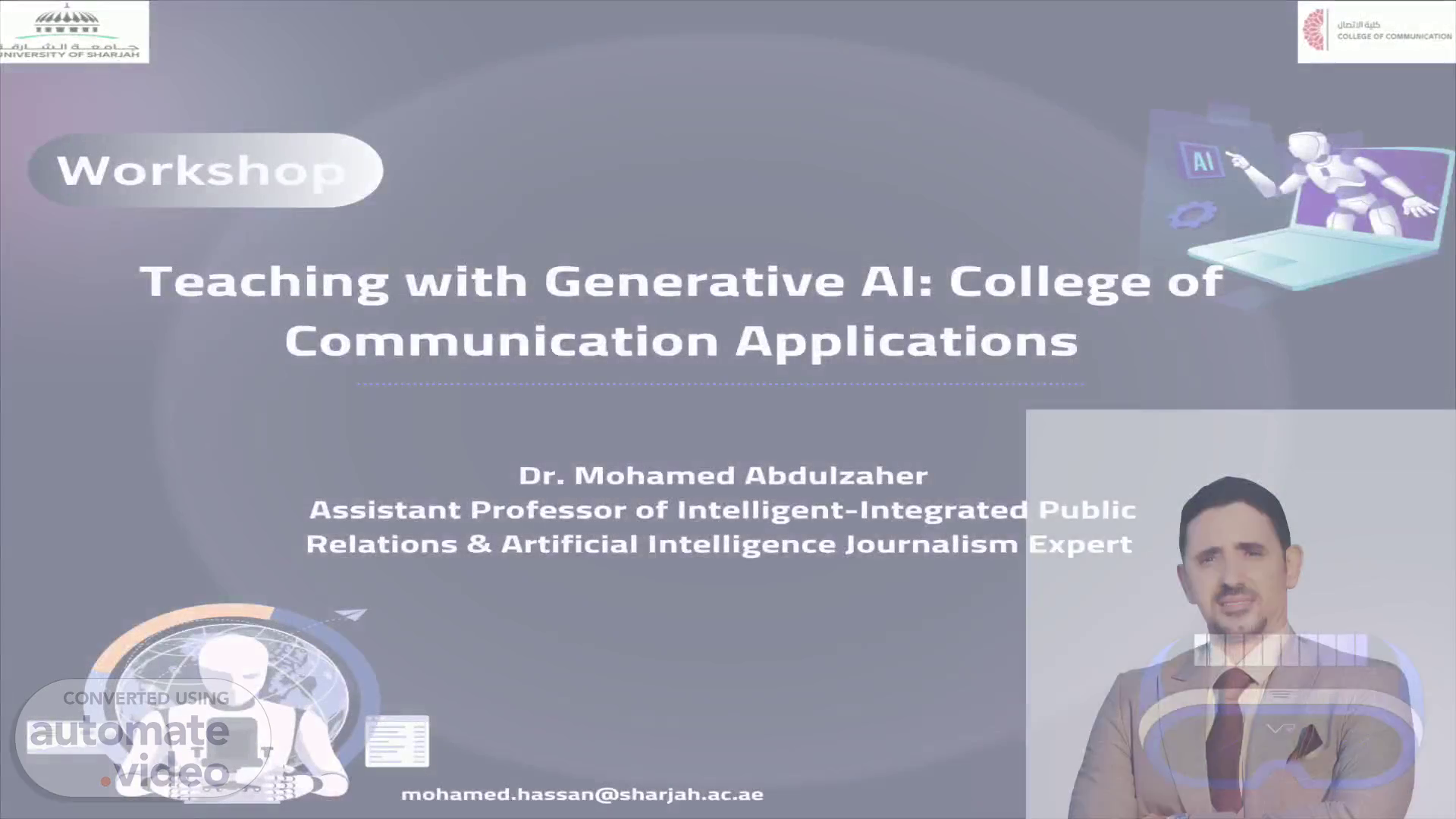 dLniJI COLLEGE SHARJAH Workshop Teaching with Generative A1: College of Communication Applications Dr. Moharned Abdulzaher Assistant Professor of Intelligent-Integrated Public Relations & Artificial Intelligence Journalism Expert [email protected].