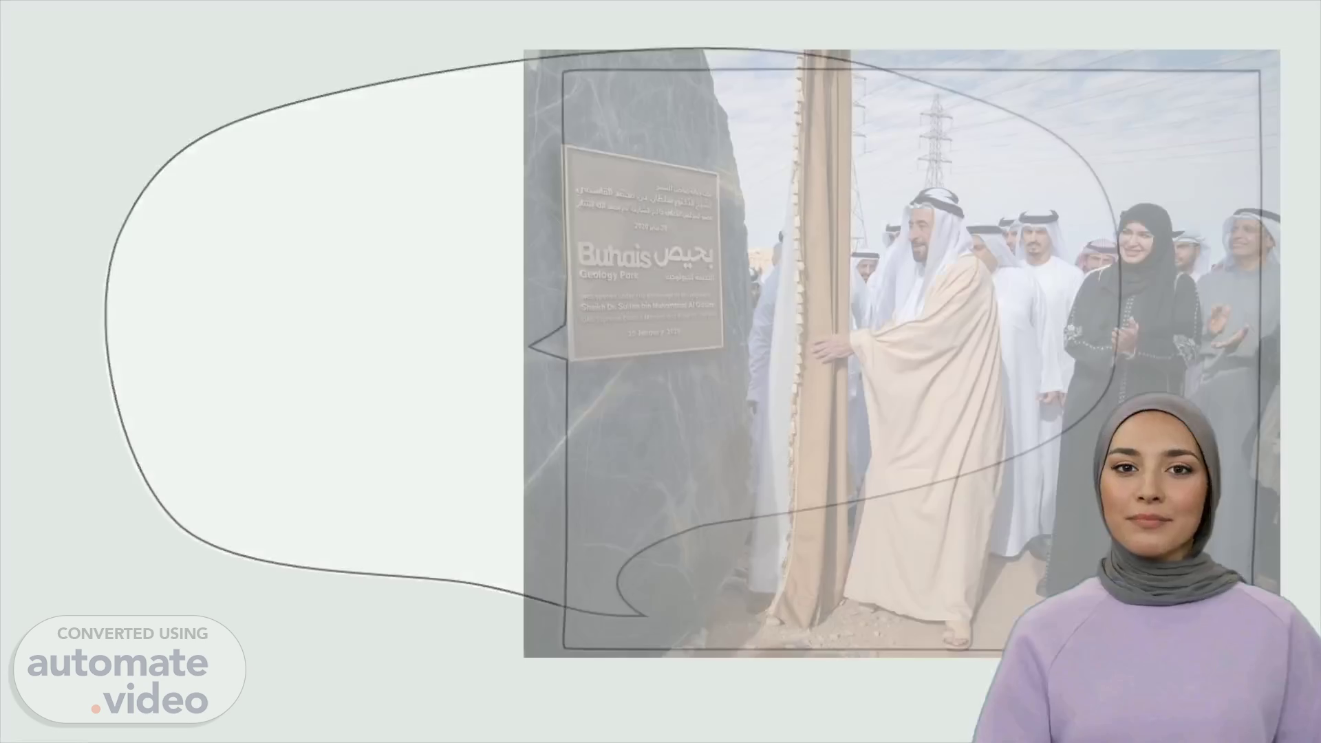 [Virtual Presenter] نرحب اليوم بمجموعة من الحالات التي تفضلون فيها الحضور سواءا كانت الشخصيات الحيوية أو الأشياء الملائمة. ننظر بإطلالة شاملة ودقيقة إلى إدخال جديد لحديقة بحيص الجيولوجية التي تم إفتتاحها عام 2019 وذلك من أجل التعريف بالأهمية الجيولوجية لجبل البحيص ومناطق الشارقة التي تحط به. نطلع الآن على نظرة سحرية على الحديقة من ناحية تاريخية جيولوجية بالإضافة إلى الآثار الثقافية والأخلاقية التي تركها على المنظر الحالي للحديقة. لنبدأ التعرف على الحديقة الجيولوجية بحيص..
