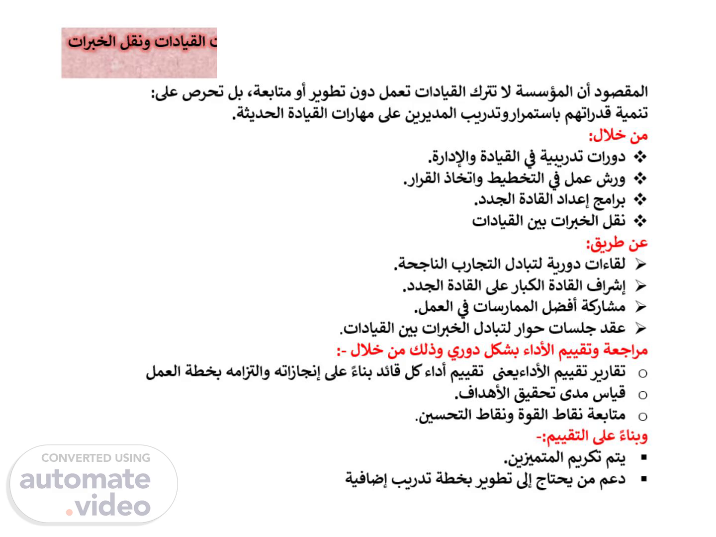 المقصود أن المؤسسة لا تترك القيادات تعمل دون تطوير أو متابعة، بل تحرص على: تنمية قدراتهم باستمراروتدريب المديرين على مهارات القيادة الحديثة. من خلال: دورات تدريبية في القيادة والإدارة. ورش عمل في التخطيط واتخاذ القرار. برامج إعداد القادة الجدد. نقل الخبرات بين القيادات عن طريق: لقاءات دورية لتبادل التجارب الناجحة. إشراف القادة الكبار على القادة الجدد. مشاركة أفضل الممارسات في العمل. عقد جلسات حوار لتبادل الخبرات بين القيادات. مراجعة وتقييم الأداء بشكل دوري وذلك من خلال -: تقارير تقييم الأداءيعنى تقييم أداء كل قائد بناءً على إنجازاته والتزامه بخطة العمل قياس مدى تحقيق الأهداف. متابعة نقاط القوة ونقاط التحسين. وبناءً على التقييم-: يتم تكريم المتميزين. دعم من يحتاج إلى تطوير بخطة تدريب إضافية.