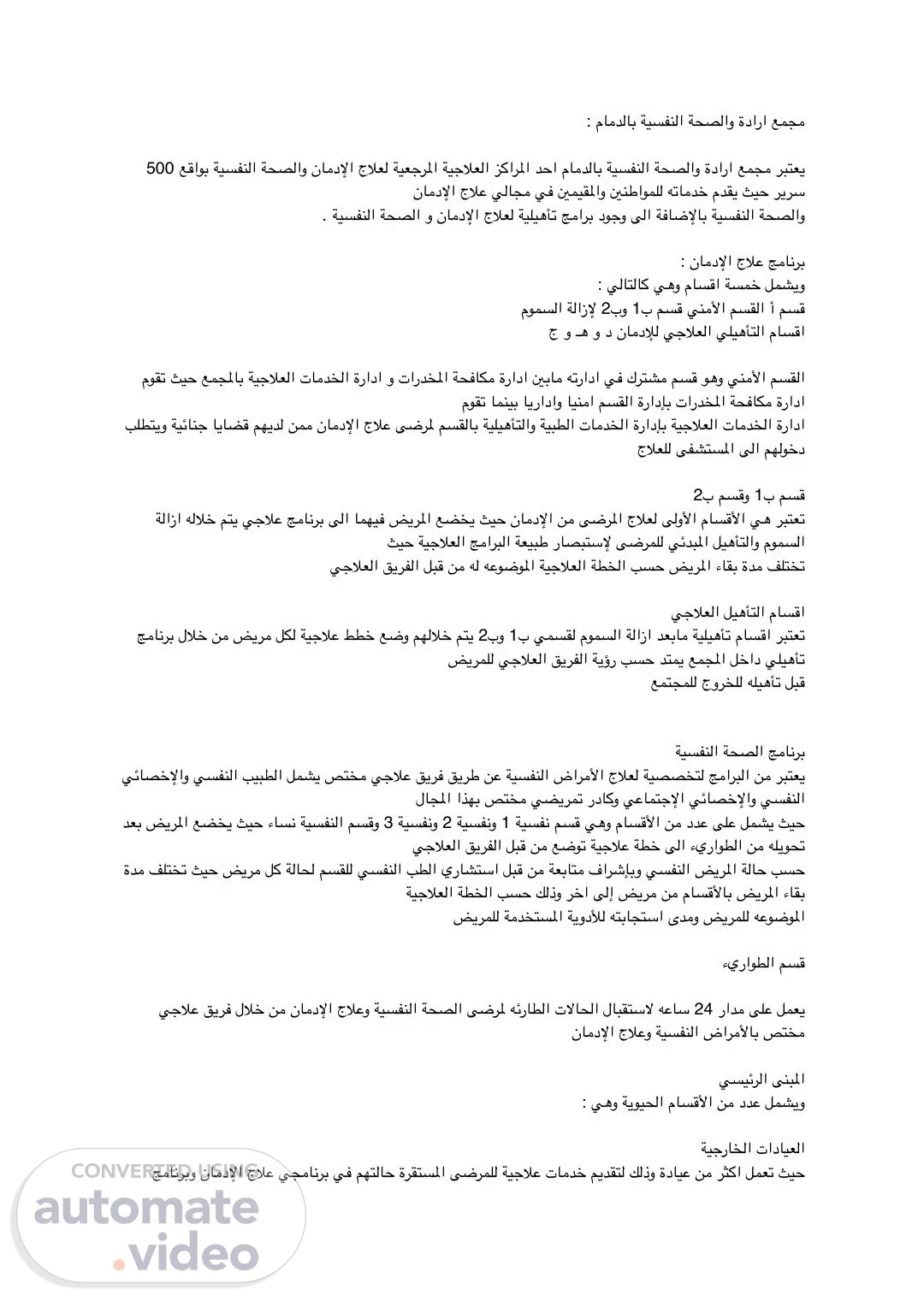 [Audio] مجمع الارادة والصحة النفسية يعد بمثابة مرجع لقضاء الحاجة إلى خدمات علاج الإدمان والصحة النفسية للمواطنين والمقيمين في المنطقة. لتحسين الخدمات المقدمة، يقدم المجمع خدمات سريرية علاجية وبرامج علاجية وتأهيلية ومراكز طبية متخصصة، بالإضافة إلى الخدمات الصحية الاختصاصية في التشخيص الصحي والطبيعة المستخدمة في الدم للعلاجات النفسية. كما يوفر المجمع خدمات الصيدلي وتحضير واعداد الوجبات الغذائية لتحسين الخدمات المقدمة. وتتضمن أنشطة المجمع أيضا تعميم فعال من البرامج الوقائية والتأهيلية التي تقوم عبر تعاونها مع المجتمع والجهات المعنية لتقديم برامج صحية ومتنوعة للمواطنين والمقيمين..
