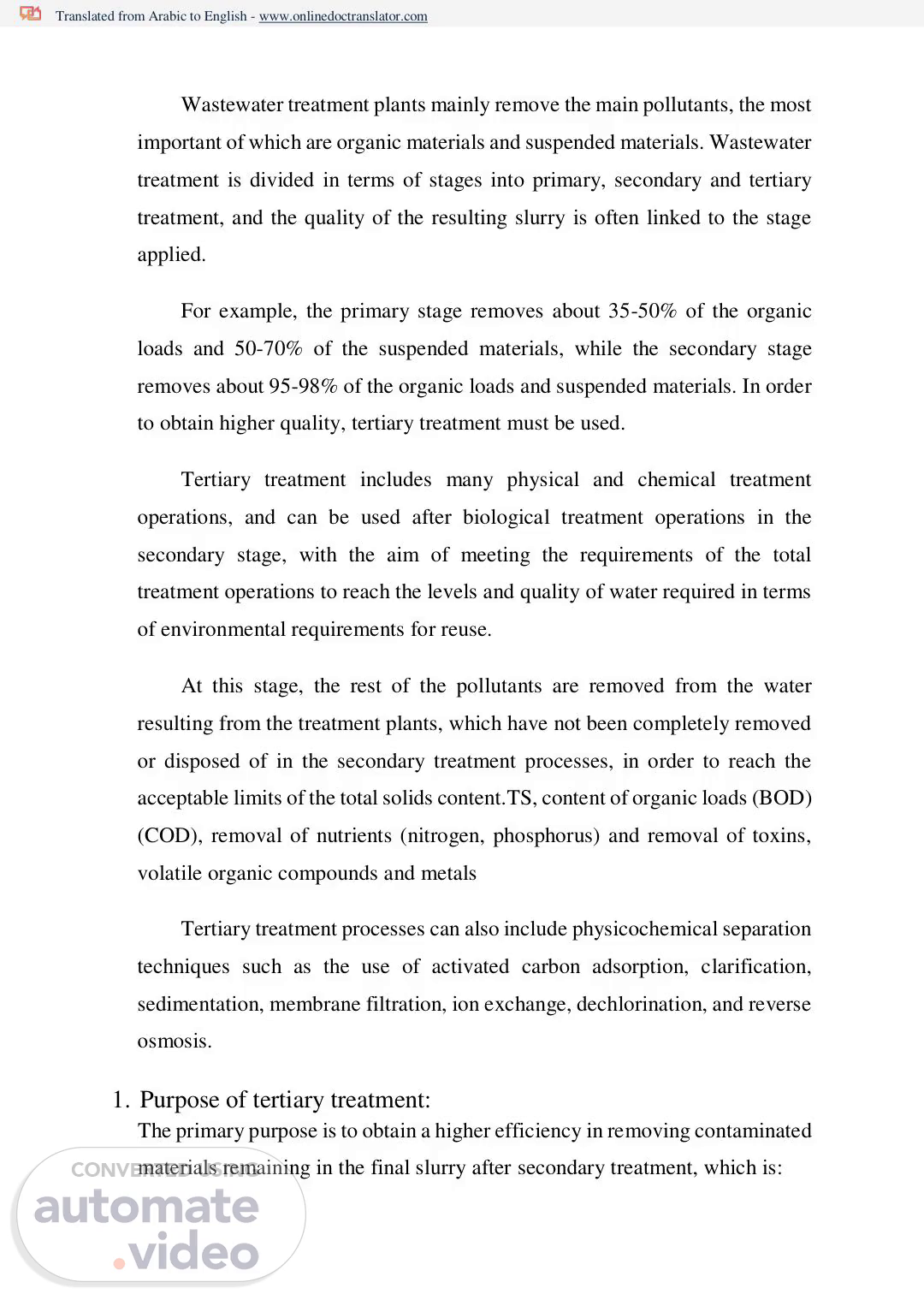 [Audio] Translated from Arabic to English www.onlinedoctranslator.com Wastewater treatment plants mainly remove the main pollutants the most important of which are organic materials and suspended materials. Wastewater treatment is divided in terms of stages into primary secondary and tertiary treatment and the quality of the resulting slurry is often linked to the stage applied. For example the primary stage removes about 35-50% of the organic loads and 50-70% of the suspended materials while the secondary stage removes about 95-98% of the organic loads and suspended materials. In order to obtain higher quality tertiary treatment must be used. Tertiary treatment includes many physical and chemical treatment operations and can be used after biological treatment operations in the secondary stage with the aim of meeting the requirements of the total treatment operations to reach the levels and quality of water required in terms of environmental requirements for reuse. At this stage the rest of the pollutants are removed from the water resulting from the treatment plants which have not been completely removed or disposed of in the secondary treatment processes in order to reach the acceptable limits of the total solids content.TS content of organic loads (B-O-D--) (C-O-D--) removal of nutrients (nitrogen phosphorus) and removal of toxins volatile organic compounds and metals Tertiary treatment processes can also include physicochemical separation techniques such as the use of activated carbon adsorption clarification sedimentation membrane filtration ion exchange dechlorination and reverse osmosis. 1. Purpose of tertiary treatment: The primary purpose is to obtain a higher efficiency in removing contaminated materials remaining in the final slurry after secondary treatment which is:.