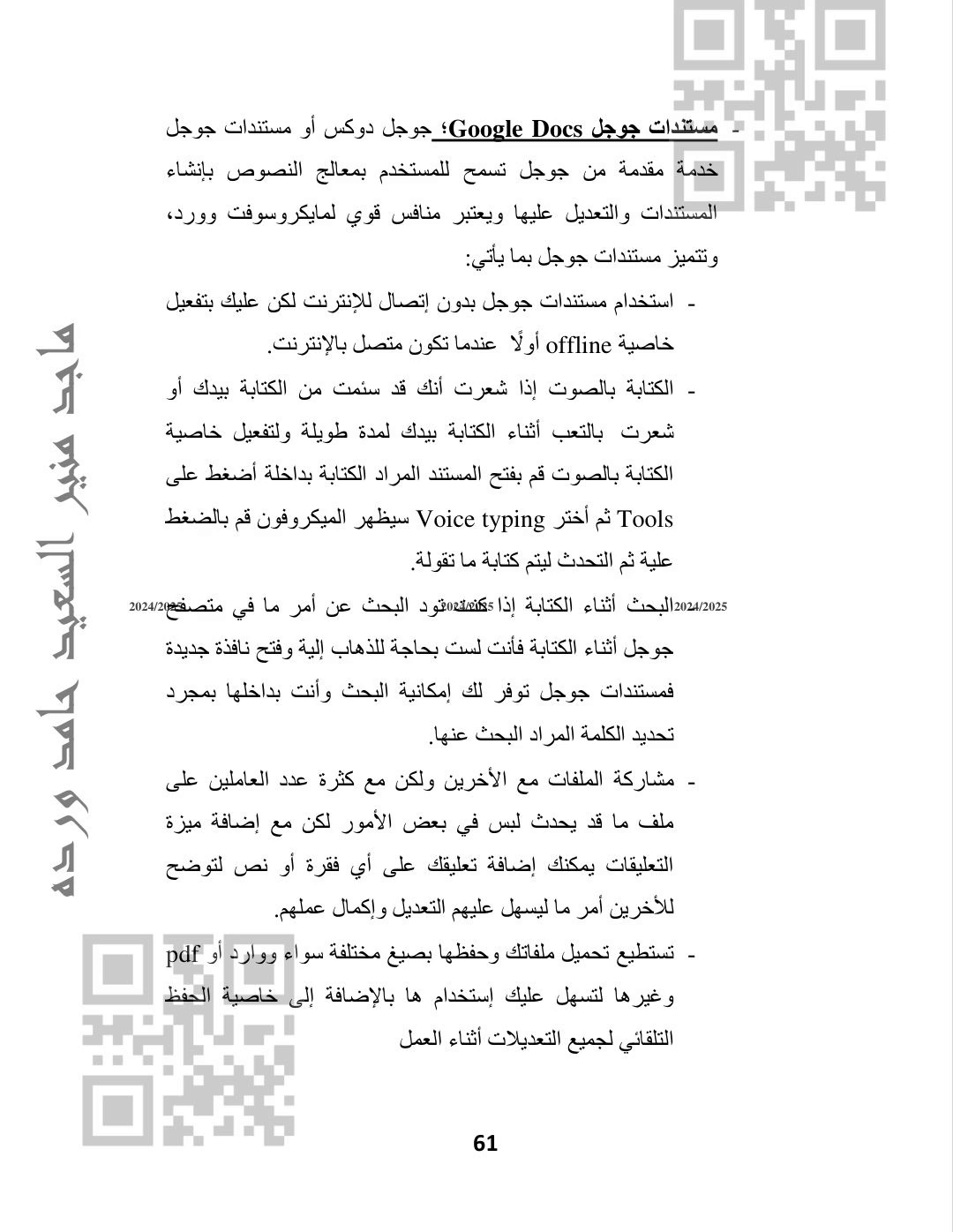 2024/2025 2024/2025 2024/2025 61 Google Docs لجوج تادنتسم - ؛ تادنتسم وأ سكود لجوج لجوج حمست لجوج نم ةمدقم ةمدخ ءاشنإب صوصنلا جلاعمب مدختسملل دروو تفوسوركيامل يوق سفانم ربتعيو اهيلع ليدعتلاو تادنتسملا ، :يتأي امب لجوج تادنتسم زيمتتو - مادختسا ليعفتب كيلع نكل تنرتنلإل لاصتإ نودب لجوج تادنتسم offline ةيصاخ ًلاوأ تنرتنلإاب لصتم نوكت امدنع. - ةباتكلا وأ كديب ةباتكلا نم تمئس دق كنأ ترعش اذإ توصلاب ترعش ةيصاخ ليعفتلو ةليوط ةدمل كديب ةباتكلا ءانثأ بعتلاب ىلع طغضأ ةلخادب ةباتكلا دارملا دنتسملا حتفب مق توصلاب ةباتكلا Voice typing رتخأ مث Tools طغضلاب مق نوفوركيملا رهظيس ةيلع ةلوقت ام ةباتك متيل ثدحتلا مث. - ثحبلا حفصتم يف ام رمأ نع ثحبلا دوت تنك اذإ ةباتكلا ءانثأ ةديدج ةذفان حتفو ةيلإ باهذلل ةجاحب تسل تنأف ةباتكلا ءانثأ لجوج درجمب اهلخادب تنأو ثحبلا ةيناكمإ كل رفوت لجوج تادنتسمف اهنع ثحبلا دارملا ةملكلا ديدحت. - ةكراشملماعلا ددع ةرثك عم نكلو نيرخلأا عم تافلملا ىلع ني ةزيم ةفاضإ عم نكل روملأا ضعب يف سبل ثدحي دق ام فلم حضوتل صن وأ ةرقف يأ ىلع كقيلعت ةفاضإ كنكمي تاقيلعتلا يل ام رمأ نيرخلألمهلمع لامكإو ليدعتلا مهيلع لهس. - عيطتست وأ دراوو ءاوس ةفلتخم غيصب اهظفحو كتافلم ليمحت pdf إ ةفاضلإاب اه مادختسإ كيلع لهستل اهريغو ظفحلا ةيصاخ ىل لمعلا ءانثأ تلايدعتلا عيمجل يئاقلتلا ﻩﺩﺭﻭ ﺪﻣﺎﺣ ﺪﻴﻌﺴﻟﺍ ﺮﻴﻨﻣ ﺪﺟﺎﻣ.