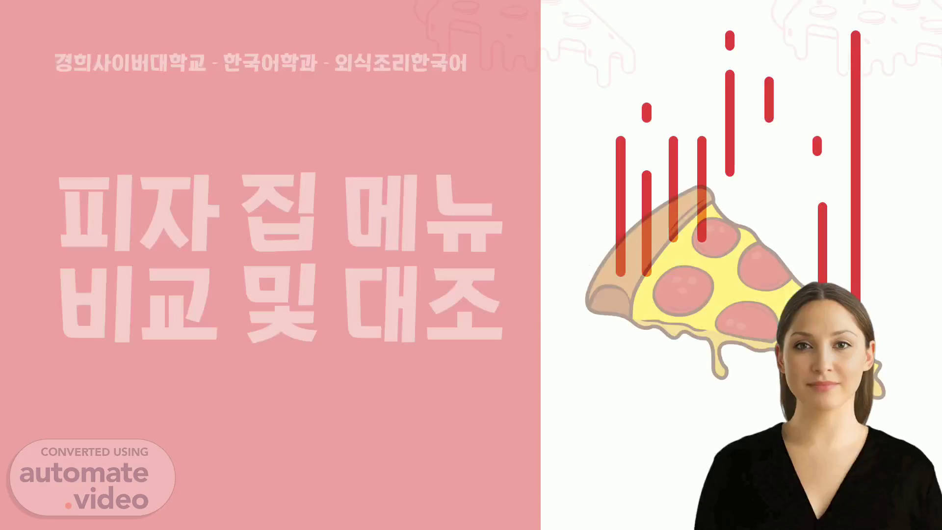 [Virtual Presenter] 결국 피자는 상호간, 그리고 사회 간에 공감과 사랑을 나눌 수 있는 완벽한 음식입니다. 따라서 저는 '피자 집 메뉴 비교 및 대조' 에 대한 발표를 하기로 결정했습니다. 트라토리아 벨로와 피자 4P's 의 메뉴들의 유사점과 차이점에 대해 깊이 있게 알아보고자 합니다. 여러분과 함께 즐거운 시간을 보내보기로 합니다..