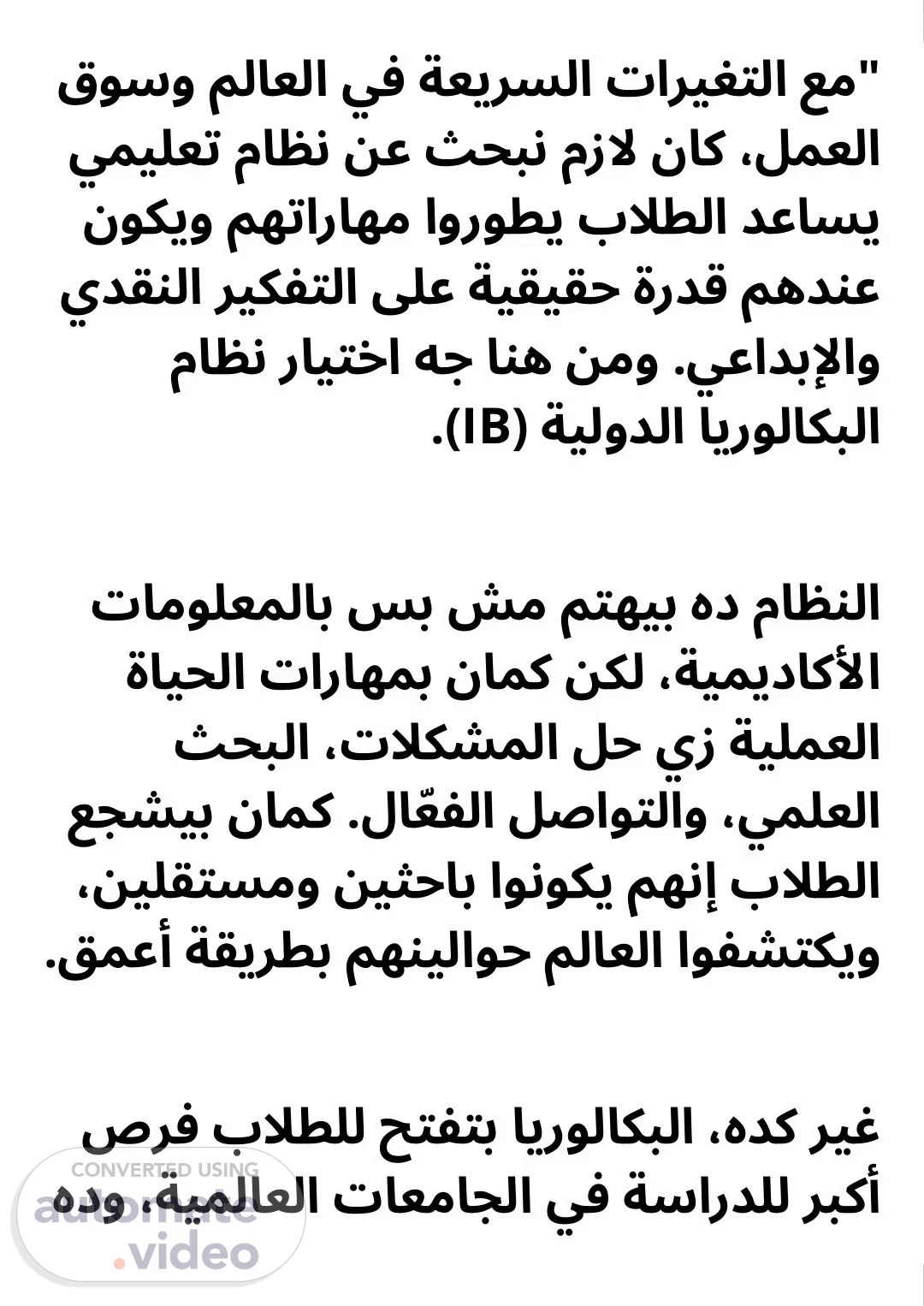 قﻮﺳو ﻢﻟﺎﻌﻟا ﻲﻓ ﺔﻌﻳﺮﺴﻟا تاﺮﻴﻐﺘﻟا ﻊﻣ" ﻲﻤﻴﻠﻌﺗ مﺎﻈﻧ ﻦﻋ ﺚﺤﺒﻧ مزﻻ نﺎﻛ ،ﻞﻤﻌﻟا نﻮﻜﻳو ﻢﻬﺗارﺎﻬﻣ اورﻮﻄﻳ بﻼﻄﻟا ﺪﻋﺎﺴﻳ يﺪﻘﻨﻟا ﺮﻴﻜﻔﺘﻟا ﲆﻋ ﺔﻴﻘﻴﻘﺣ ةرﺪﻗ ﻢﻫﺪﻨﻋ مﺎﻈﻧ رﺎﻴﺘﺧا ﻪﺟ ﺎﻨﻫ ﻦﻣو .ﻲﻋاﺪﺑﻹاو .(IB) ﺔﻴﻟوﺪﻟا ﺎﻳرﻮﻟﺎﻜﺒﻟا تﺎﻣﻮﻠﻌﻤﻟﺎﺑ ﺲﺑ ﺶﻣ ﻢﺘﻬﻴﺑ هد مﺎﻈﻨﻟا ةﺎﻴﺤﻟا تارﺎﻬﻤﺑ نﺎﻤﻛ ﻦﻜﻟ ،ﺔﻴﻤﻳدﺎﻛﻷا ﺚﺤﺒﻟا ،تﻼﻜﺸﻤﻟا ﻞﺣ يز ﺔﻴﻠﻤﻌﻟا ﻊﺠﺸﻴﺑ نﺎﻤﻛ .لﺎّﻌﻔﻟا ﻞﺻاﻮﺘﻟاو ،ﻲﻤﻠﻌﻟا ،ﻦﻴﻠﻘﺘﺴﻣو ﻦﻴﺜﺣﺎﺑ اﻮﻧﻮﻜﻳ ﻢﻬﻧإ بﻼﻄﻟا .ﻖﻤﻋأ ﺔﻘﻳﺮﻄﺑ ﻢﻬﻨﻴﻟاﻮﺣ ﻢﻟﺎﻌﻟا اﻮﻔﺸﺘﻜﻳو صﺮﻓ بﻼﻄﻠﻟ ﺢﺘﻔﺘﺑ ﺎﻳرﻮﻟﺎﻜﺒﻟا ،هﺪﻛ ﺮﻴﻏ هدو ،ﺔﻴﻤﻟﺎﻌﻟا تﺎﻌﻣﺎﺠﻟا ﻲﻓ ﺔﺳارﺪﻠﻟ ﺮﺒﻛأ.