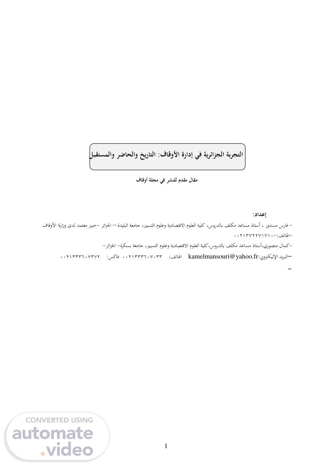 1 لا ةبرجتفاقولأا ةرادإ يف ةيرئازجلا :لاخيرات لبقتسملاو رضاحلاو م فاقوأ ةلجم يف رشنلل مدقم لاق دادعإ: - سراف رودسم، ،سوردلاب فلكم دعاسم ذاتسأ ةعماج ،يريستلا مولعو ةيداصتقلاا مولعلا ةيلك ةديلبلا– رئازلجا - فاقولأا اةرازو ىدل دمتعم يربخ -تالهاف:-0070727720200 -،يروصنم لامكةركسب ةعماج ،يريستلا مولعو ةيداصتقلاا مولعلا ةيلك،سوردلاب فلكم دعاسم ذاتسأ- رئازلجا- -نيوتركيللإا ديبرلا: [email protected]فتالها : 0070777002077 سكاف :0070777002727 -.