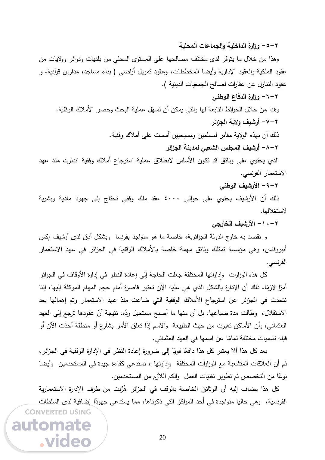 20 -5-2 ةيلحملا تاعامجلاو ةيلخادلا ةرازو نم تايلاوو رئاودو تايدطب نم يطاملا ىوتسملا ىطع اهالاصم فطتخم ىدل رفوتي ام للاخ نم اذهو ع و ةيكطملا دوقضيأو ةيرادلإا دوقعلا و ،تاططخملا ا يضارأ ليومت دوقع ( ،ةينآرق سرادم ،دجاسم ءانب و ةينيدلا تايعمجلا لاصل تاراقع نع لزانتلا دوقع.) 2-6- ينطولا عافدلا ةرازو ةيفقولا كلاملأا رصاو ابلا ةيطمع ل هست نأ نكمي يتلاو اهل ةعباتلا طئارخلا للاخ نم اذهو. 2-7- رئازجلا ةيلاو فيشرأ ذهب نأ كلذةيفقو كلامأ ىطع تسسأ نييايسمو نيمطسمل رباقم ةيلاولا ه. 2-0- رئازجلا ةنيدمل يبعشلا سلجملا فيشرأ دهع ذنم ترثدنا ةيفقو كلامأ عاجرتسا ةيطمع قلاطنلا ساسلأا نوكت دق قئاثو ىطع يوتاي يذلا يسنرفلا رامعتسلاا. 2- - ينطولا فيشرلا يلاوا ىطع يوتاي فيشرلأا نأ كلذ 111 ع ةيرشبو ةيدام دوهج ىلإ جاتات يفقو كطم دق اهللاغتسلا. 2-18- يجراخلا فيشرلا سكإ فيشرأ ىدل قدأ لكشبو اسنرفب دجاوتم وه ام ةصاخ ،ةيرئازجلا ةلودلا جراخ هب دصقن و رامعتسلاا دهع يف رئازجلا يف ةيفقولا كلاملأاب ةصاخ ةمهم قئاثو كطتمت ةسسؤم يهو ،سنفوربنأ يسنرفلا. لك رئازجلا يف فاقولأا ةرادإ يف رظنلا ةداعإ ىلإ ةجاالا تطعج ةفطتخملا اهتاراد او تارازولا هذه اننإ ،اهيلإ ةطكوملا ماهملا مجا مامأ ةرصاق ربتعت نلآا هيطع يه يذلا لكشلاب ةرادلإا نأ كلذ ،اًمزلا اًرمأ لاا دهع ذنم تعاض يتلا ةيفقولا كلاملأا عاجرتسا نع رئازجلا يف داتن دعب اهلامهإ متو رامعتس دهعلا ىلإ عجرت اهدوقع نأ ةجيتن ،ه در لياتسم بصأ ام اهنم نأ لب ،اهعايض ةدم تلاطو ،للاقتسلاا وأ نلآا تذخأ ةقطنم وأ عراشب رملأا قطعت اذإ مسلااو ةعيبطلا يا نم تريغت نكاملأا نأو ،ينامثعلا دهعلا يف اهمسا نع اًمامت ةفطتخم تايمست هطبقينامثعلا. اذه لك دعب ،رئازجلا يف ةيفقولا ةرادلإا يف رظنلا ةداعإ ةرورض ىلإ اًيوق اًعفاد اذه لك ربتعي لاأ اضيأو نيمدختسملا يف ةديج ةءافك يعدتست ، اهتراد او ةفطتخملا تارازولا عم ةبعشتملا تاقلاعلا نأ مث ا نم مزلالا مكلاو لمعلا تاينقت ريوطت مث صصختلا نم اًعوننيمدختسمل. ةيرامعتسلاا ةرادلإا فرط نم تبِّرُه رئازجلا يف فقولاب ةصاخلا قئاثولا نأ هيلإ فاضي اذه لك تاططسلا ىدل ةيفاضإ اًدوهج يعدتسي امم ،اهانركذ يتلا زكارملا داأ يف ةدجاوتم ايلاا يهو ،ةيسنرفلا.