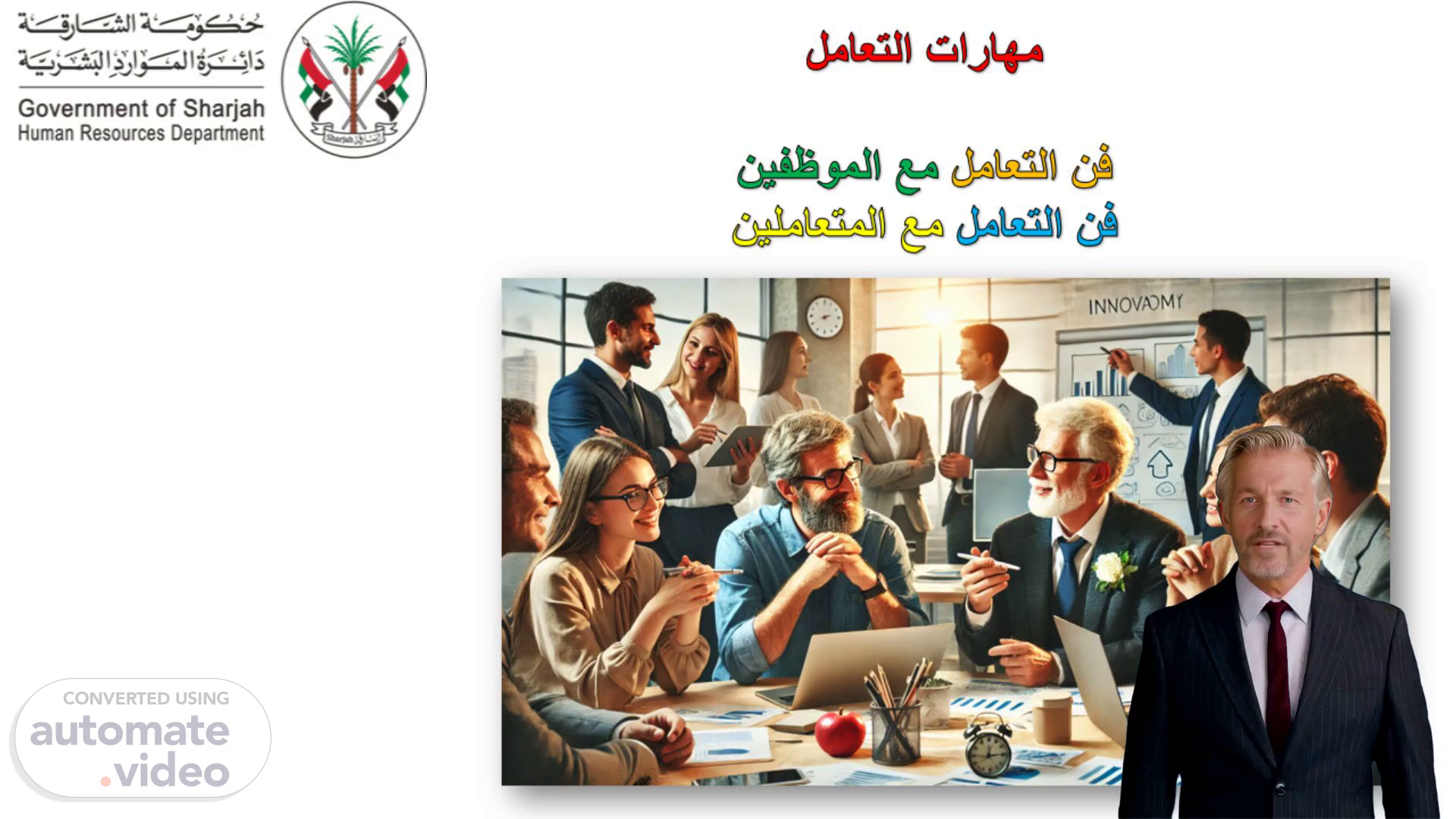 [Audio] "في هذا الدرس سنتحدث عن المهارات اللازمة للتعامل في بيئة العمل. سنبدأ بالحديث عن فن التعامل مع الموظفين وأهمية فهم العماد الأساسي لأي منظمة وأهمية بناء العلاقة معهم على الاحترام والثقة وتوفير الدعم اللازم لهم. كما يجب أن نوفر بيئة عمل مريحة ومحفزة لهم. بالنسبة لفن التعامل مع المتعاملين، يجب الاهتمام بالتعامل معهم بجدية واحترام، وتوفير الحلول لمشكلاتهم بسرعة وتعامل معهم بشكل متفهم. هذه المهارات مهمة لتحقيق أهدافنا كمنظمة. يجب علينا الاستمرار في تطوير قدراتنا والتعلم لتحسين علاقاتنا مع الآخرين. شكرا لاهتمامكم وتفاعلكم مع هذا الدرس ونلتقي في الدرس القادم. شكرا..
