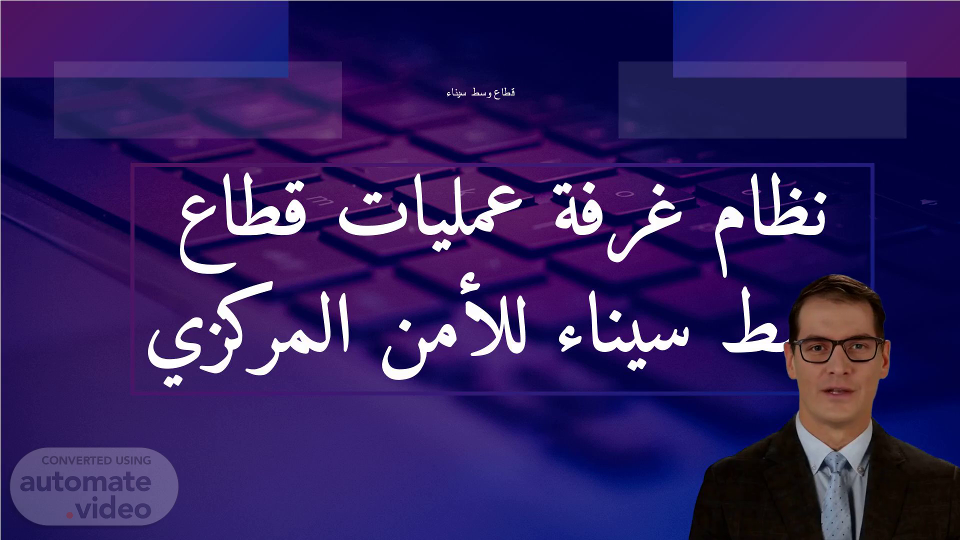 [Virtual Presenter] مرحبا وأهلاً بكم في تقديم الشريحة الأولى من عرضنا التدريبي حول نظام غرفة عمليات قطاع وسط سيناء للأمن المركزي. يهدف هذا النظام إلى تعزيز الأمن والحفاظ على الاستقرار في المنطقة وتعزيز جهودنا لحماية مواطنينا. نتطلع إلى مشاركتكم في هذا التدريب ونأمل أن تستفيدوا منه وتستمتعوا بمعرفة المزيد حول غرفة العمليات في قطاع وسط سيناء. شكراً لكم على وقتكم وتفاعلكم معنا..