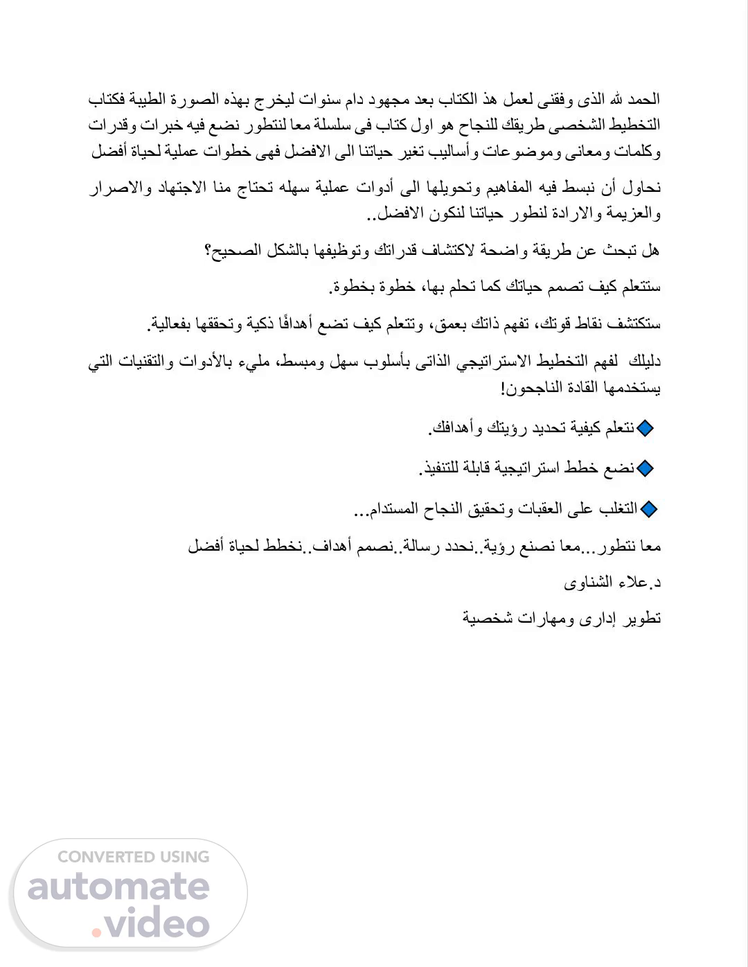 [Audio] جرخيل تاونس ماد دوهجم دعب باتكلا ذه لمعل ىنقفو ىذلا لله دمحلاف ةبيطلا ةروصلا هذهبباتك طيطختلا ىصخشلا كقيرط حاجنلل وه لوا باتك ىف ةلسلس اعم روطتنل عضن هيف تاربخ تاردقو تاملكو ىناعمو تاعوضومو بيلاسأو ريغت انتايح ىلا لضفلاا ىهف تاوطخ ةيلمع ةايحل لضفأ لواحن نأ طسبن هيف ميهافملا اهليوحتو ىلا تاودأ ةيلمع هلهس جاتحت انم داهتجلاا رارصلااو ةميزعلاو ةدارلااو روطنل انتايح نوكنل لضفلاا .. له ثحبت نع ةقيرط ةحضاو فاشتكلا كتاردق اهفيظوتو لكشلاب ؟حيحصلا ملعتتس فيك ممصت كتايح امك ملحت ،اهب ةوطخ ةوطخب. فشتكتس طاقن ،كتوق مهفت كتاذ ،قمعب ملعتتو فيك عضت اًفادهأ ةيكذ اهققحتو ةيلاعفب. كليلد مهفل طيطختلا يجيتارتسلاا ىتاذلا بولسأب لهس ،طسبمو ءيلم تاودلأاب تاينقتلاو يتلا اهمدختسي ةداقلا نوحجانلا! ملعتن ةيفيك ديدحت كتيؤر كفادهأو. عضن ططخ ةيجيتارتسا ةلباق ذيفنتلل. بلغتلا ىلع تابقعلا قيقحتو حاجنلا مادتسملا... اعم روطتن ...اعم عنصن ةيؤر ..ددحن ةلاسر..ممصن فادهأ..ططخن ةايحل لضفأ د.ءلاع ىوانشلا ريوطت ىرادإ تاراهمو ةيصخش.