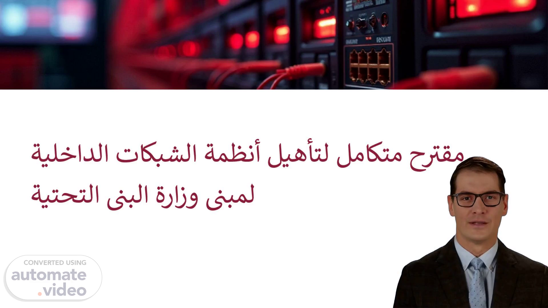 [Audio] "نتحدث اليوم عن الفوائد المتوقعة من تنفيذ مقترحنا الشامل حول "تأهيل أنظمة الشبكات الداخلية لمبنى وزارة البنى التحتية"."زيادة الكفاءة التشغيلية، تقليل الوقت المستغرق لإنجاز المهام والإجراءات، تحقيق الأمن وحماية البيانات، تخفيض التكاليف، تحسين جودة الخدمات، وتمكين الوزارة للتحول الرقمي الشامل واعتماد التقنيات المستقبلية. هذه هي النتائج المتوقعة من تنفيذ مقترحنا الشامل. نشكركم على متابعتكم ونود توضيح أن المقترح يمكن تطويره وتفصيله بناءً على دراسة الاحتياجات الدقيقة للمبنى وميزانيته الزمنية والمالية. شكراً لكم..