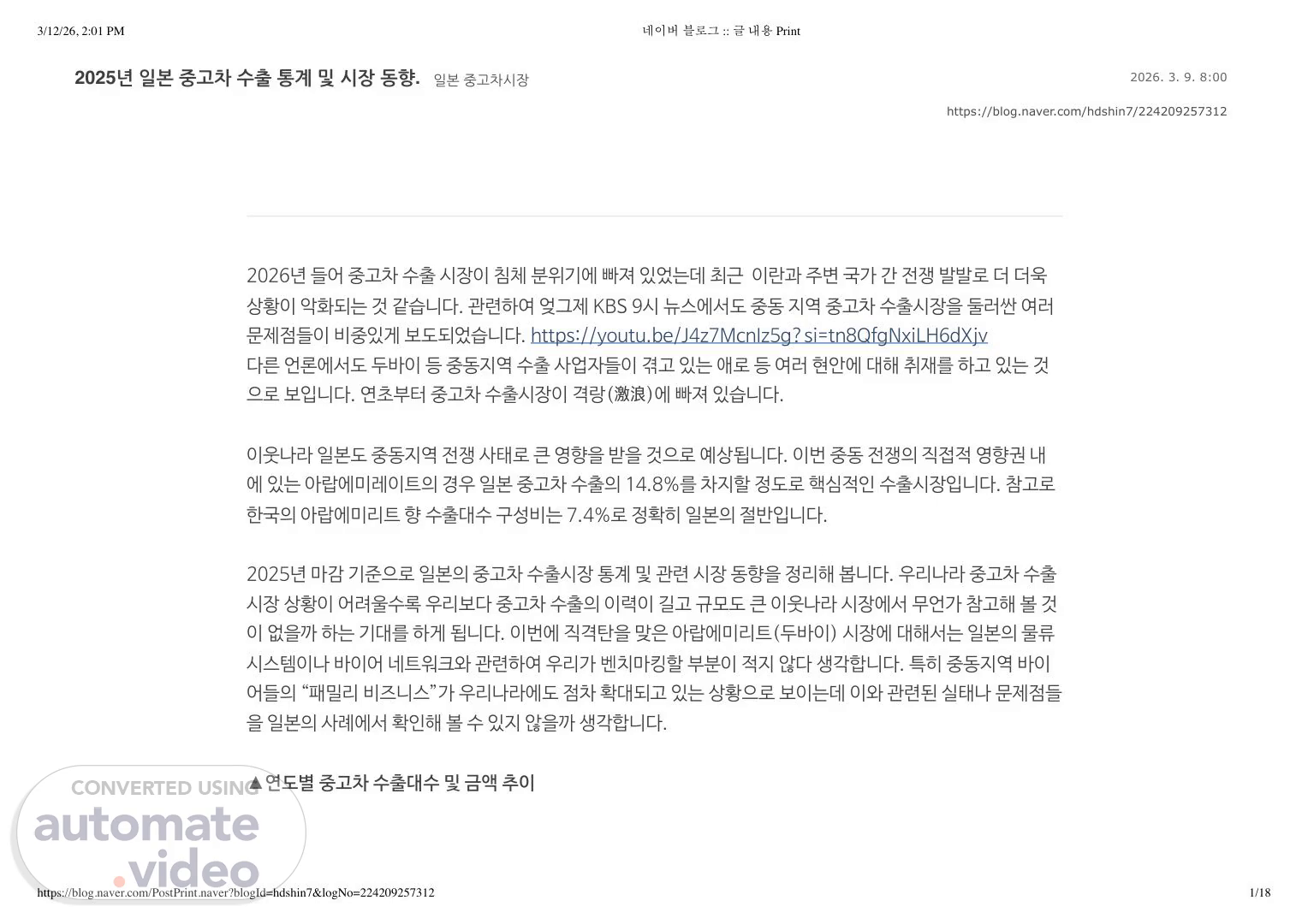 2025년 일본 중고차 수출 통계 및 시장 동향. 일본 중고차시장 2026. 3. 9. 8:00 https://blog.naver.com/hdshin7/224209257312 2026년 들어 중고차 수출 시장이 침체 분위기에 빠져 있었는데 최근 이란과 주변 국가 간 전쟁 발발로 더 더욱 상황이 악화되는 것 같습니다. 관련하여 엊그제 KBS 9시 뉴스에서도 중동 지역 중고차 수출시장을 둘러싼 여러 문제점들이 비중있게 보도되었습니다. https://youtu.be/J4z7McnIz5g?si=tn8QfgNxiLH6dXjv 다른 언론에서도 두바이 등 중동지역 수출 사업자들이 겪고 있는 애로 등 여러 현안에 대해 취재를 하고 있는 것 으로 보입니다. 연초부터 중고차 수출시장이 격랑(激浪)에 빠져 있습니다. 이웃나라 일본도 중동지역 전쟁 사태로 큰 영향을 받을 것으로 예상됩니다. 이번 중동 전쟁의 직접적 영향권 내 에 있는 아랍에미레이트의 경우 일본 중고차 수출의 14.8%를 차지할 정도로 핵심적인 수출시장입니다. 참고로 한국의 아랍에미리트 향 수출대수 구성비는 7.4%로 정확히 일본의 절반입니다. 2025년 마감 기준으로 일본의 중고차 수출시장 통계 및 관련 시장 동향을 정리해 봅니다. 우리나라 중고차 수출 시장 상황이 어려울수록 우리보다 중고차 수출의 이력이 길고 규모도 큰 이웃나라 시장에서 무언가 참고해 볼 것 이 없을까 하는 기대를 하게 됩니다. 이번에 직격탄을 맞은 아랍에미리트(두바이) 시장에 대해서는 일본의 물류 시스템이나 바이어 네트워크와 관련하여 우리가 벤치마킹할 부분이 적지 않다 생각합니다. 특히 중동지역 바이 어들의 “패밀리 비즈니스”가 우리나라에도 점차 확대되고 있는 상황으로 보이는데 이와 관련된 실태나 문제점들 을 일본의 사례에서 확인해 볼 수 있지 않을까 생각합니다. ▲연도별 중고차 수출대수 및 금액 추이 3/12/26, 2:01 PM 네이버 블로그 :: 글 내용 Print https://blog.naver.com/PostPrint.naver?blogId=hdshin7&logNo=224209257312 1/18.