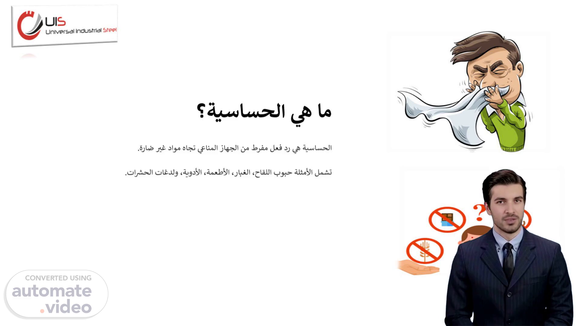 [Audio] الصوت ينبعث بالشكل الصحيح كما يقول المثل القديم "الحياة أمر حساس". الحساسية هي تفاعل مفرط للجهاز المناعي تجاه المواد غير الضارة. تؤثر هذه الحساسية على أكثر من 30% من سكان العالم. ما هو العلاج المناسب للحساسية؟ عند تعرض الشخص للحساسية، الخطوة الأولى للعلاج هي استخدام مضادات الهيستامين لتخفيف الحكة وعرق الأنف والأعراض الأخرى. في حالة الحساسية الشديدة، يتم استخدام الكورتيكوستيرويدات للتخفيف من الالتهاب بواسطة بخاخات أو كريمات. في بعض الحالات، يقدم الطبيب حقن الحساسية لتعزيز تحمل الجسم للمواد المسببة للحساسية. بهذه الطريقة، يصبح الجسم متعودًا على تلك المواد ولا يصاب بالحساسية مرة أخرى. تذكر دائمًا بأن الحساسية قد تؤثر على حياتك اليومية، لذلك من الضروري علاجها بشكل صحيح وفعال. توفر الخيارات العلاجية مثل مضادات الهيستامين والكورتيكوستيرويدات وحقن الحساسية تخفيف الأعراض وتحسين نوعية الحياة. هذه كانت معلوماتنا حول علاج الحساسية. نلتقي في الشريحة التالية..