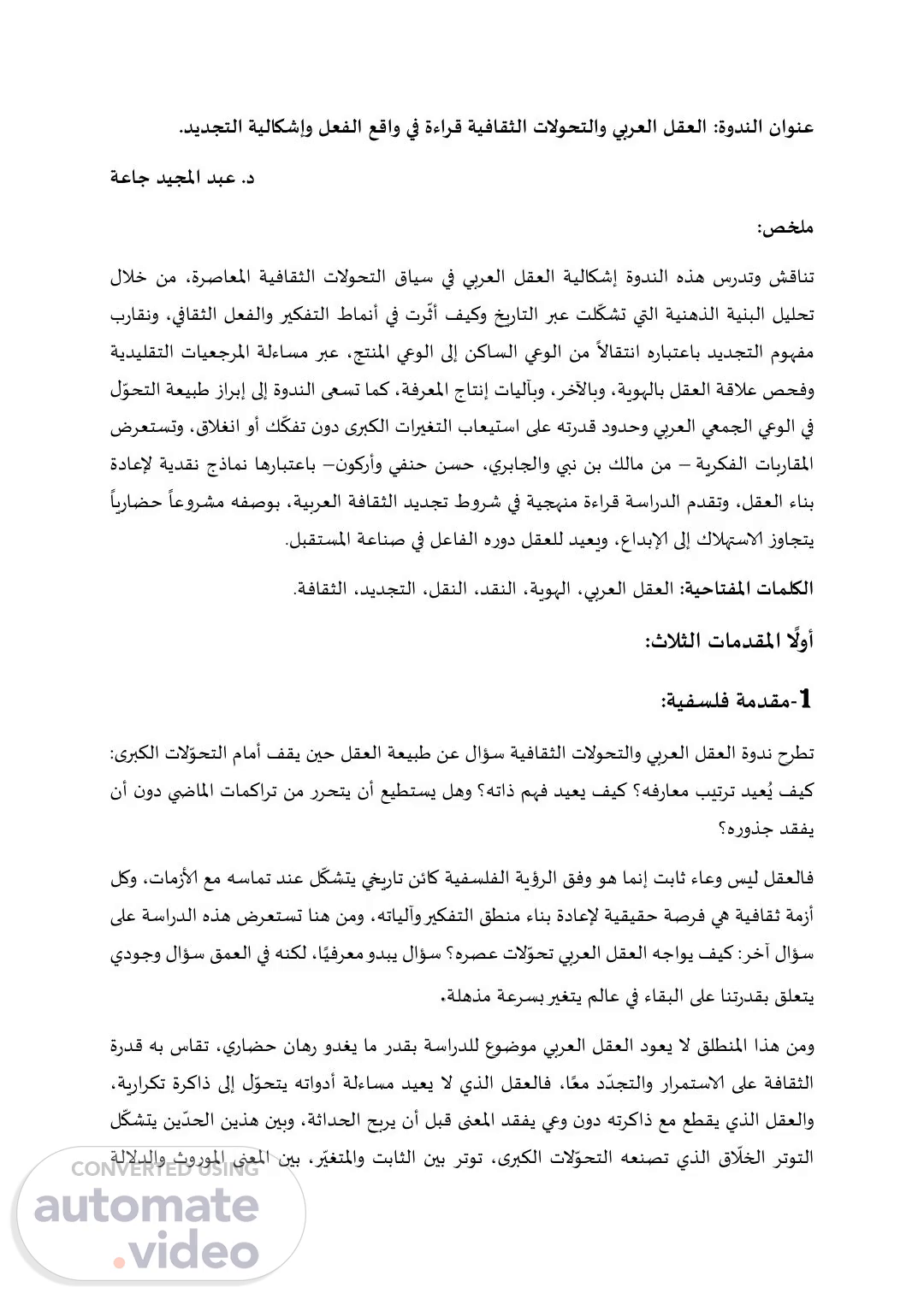 :ةودنلا ناونع و لعفلا عقاو يف ةءارق ةيفاقثلا تلاوحتلاو يبرعلا لقعلاإديدجتلا ةيلاكش. ةعاج ديجلما دبع .د :صخلم سردتو شقانت هذه ةودنلا ةيلاكشإ لقعلا يبرعلا يف قايس تلاوحتلا ةيفاقثلا ،ةرصاعلما نم خللا ليلحت ةينبلا ةينهذلا يتلا تلّكشت ربع خيراتلا فيكو ترّثأ يف طامنأ ريكفتلا لعفلاو ثلا،يفاق براقنو موهفم ديدجتلا هرابتعاب ًالااقتنا نم يعولا نكاسلا ىلإ يعولا ،جتنلما ربع ةلءاسم تايعجرلما لاةيديلقت صحفو ةقلاع لقعلا ،ةيوهلاب ،رخلآابو تايلآبو جاتنإ ،ةفرعلما امك ىعست ةودنلا ىلإ زاربإ ةعيبط ًلّوحتلا يف يعولا يعمجلا يبرعلا ًودودح هتردق ىلع باعيتسا تاريغتلا ًىربكلا ًنود كّكفت وأ ،قلاغنا توضرعتس تابراقلما ةيركفلاً– نم كلام نب يبن يفنح نسح ،يرباجلاو ًنوكرأو– اهرابتعاب جذامن ةيدقن ًلةداع ءانب ،لقعلا مدقتو ةساردلا ةءارق ةيجهنم يف طورش ديدجت ةفاقثلا ،ةيبرعلا هفصوب ًااعورشم ضحًاايرا ًواجتيًز كلاهتسالا ىلإ ،عادبالإ ديعيو لقعلل هرود لعافلا يف ةعانص لبقتسلما.ً :ةيحاتفلما تاملكلا،يبرعلا لقعلا .ةفاقثلا ،ديدجتلا ،لقنلا ،دقنلا ،ةيوهلاً ثلاثلا تامدقلما الاوأ: 1-ةيفسلف ةمدقم: ت حرط ةودنةيفاقثلا تلاوحتلاو يبرعلا لقعلا لاؤس ا مامأ فقي نيح لقعلا ةعيبط نعكلا تلاّوحتل :ىرب نأ نود ي ضالما تامكارت نم ررحتي نأ عيطتسي لهو ؟هتاذ مهف ديعي فيك ؟هفراعم بيترت ديعُي فيك ؟هروذج دقفيً فتباث ءاعو سيل لقعلا امنإ وه ةيفسلفلا ةيؤرلا قفو سامت دنع لّكشتي يخيرات نئاكامزالأ عم هت، لكو ا قطنم ءانب ةداعل ةيقيقح ةصرف يه ةيفاقث ةمزأهتايلآو ريكفتل ،انه نمو ضرعتست ساردلا هذهة ىلع لاؤسرخآ يدوجو لاؤس قمعلا يف هنكل ،اايفرعم ودبي لاؤس ؟هرصع تلاّوحت يبرعلا لقعلا هجاوي فيك : ةلهذم ةعرسب ريغتي ملاع يف ءاقبلا ىلع انتردقب قلعتي.ً نمو قلطنلما اذه لا دوعي لقعلا يبرعلا عوضوم ةساردلل ردقب ام ودغي ناهر ًيراضح، تساق هب ةردق ةفاقثلا ىلع رارمتسالا دّدجتلاو ااعم، لقعلاف يذلا لا يديع ةلءاسم هتاودأ ًلّوحتي ىلإ ةركاذ يراركت،ة لقعلاو يذلا عطقي عم هتركاذ ًنود يعو دقفي ىنعلما لبق نأ حبري ةثادحلا، نيبو نيذه نيّدحلا تيلّكش رتوتلا قّلاخلا يذلا هعنصت ًلاّوحتلات ًىربكلا، رتوت نيب تباثلا ،رّيغتلماو نيب ىنعلما ًرولماثو ةللادلاو.