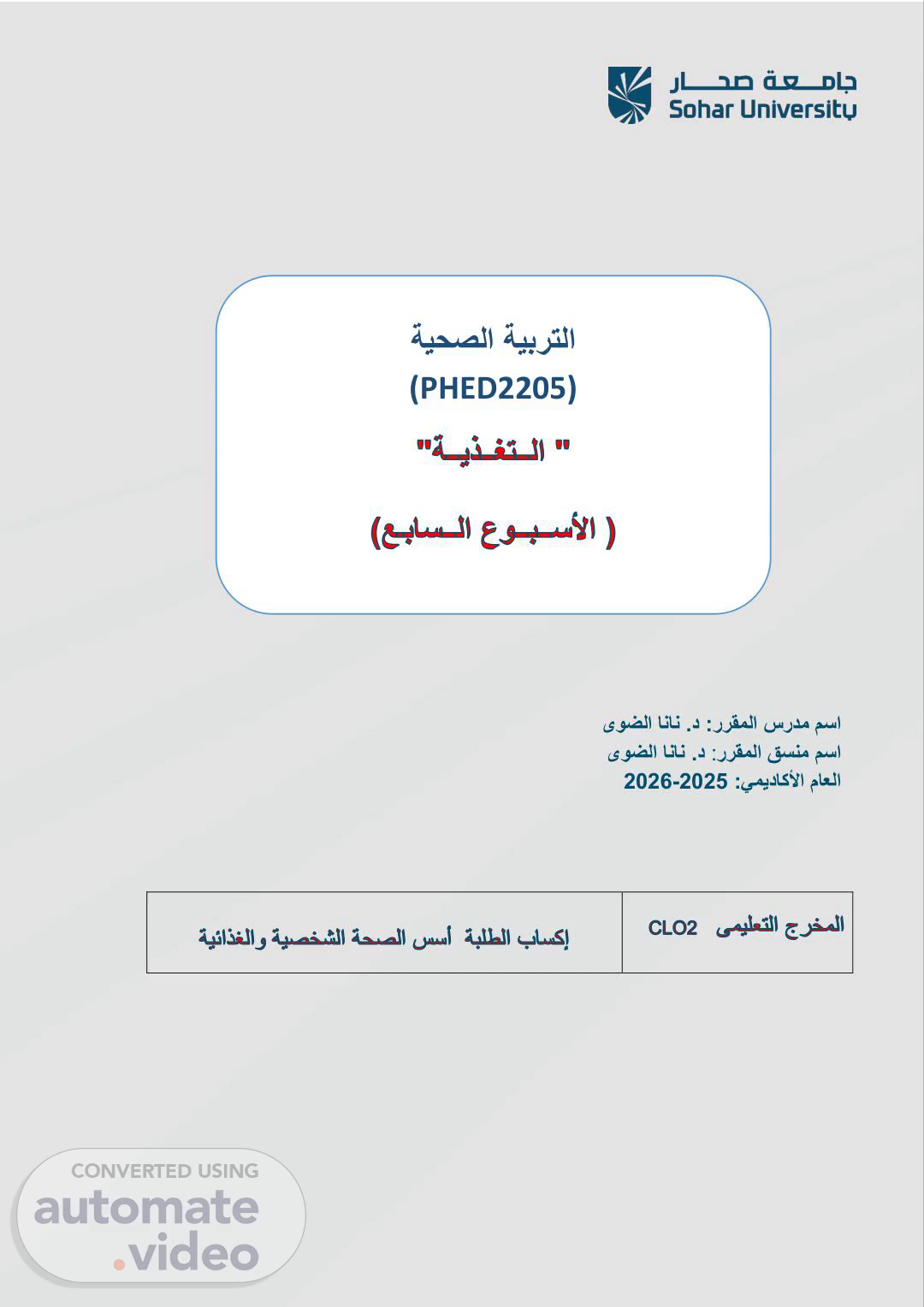 :ررقملا سردم مسا ىوضلا انان .د ررقملا قسنم مسا: ىوضلا انان .د :يميداكلأا ماعلا2025-2026 Course Coordinator Name: ةيحصلا ةيبرتلا (PHED2205).