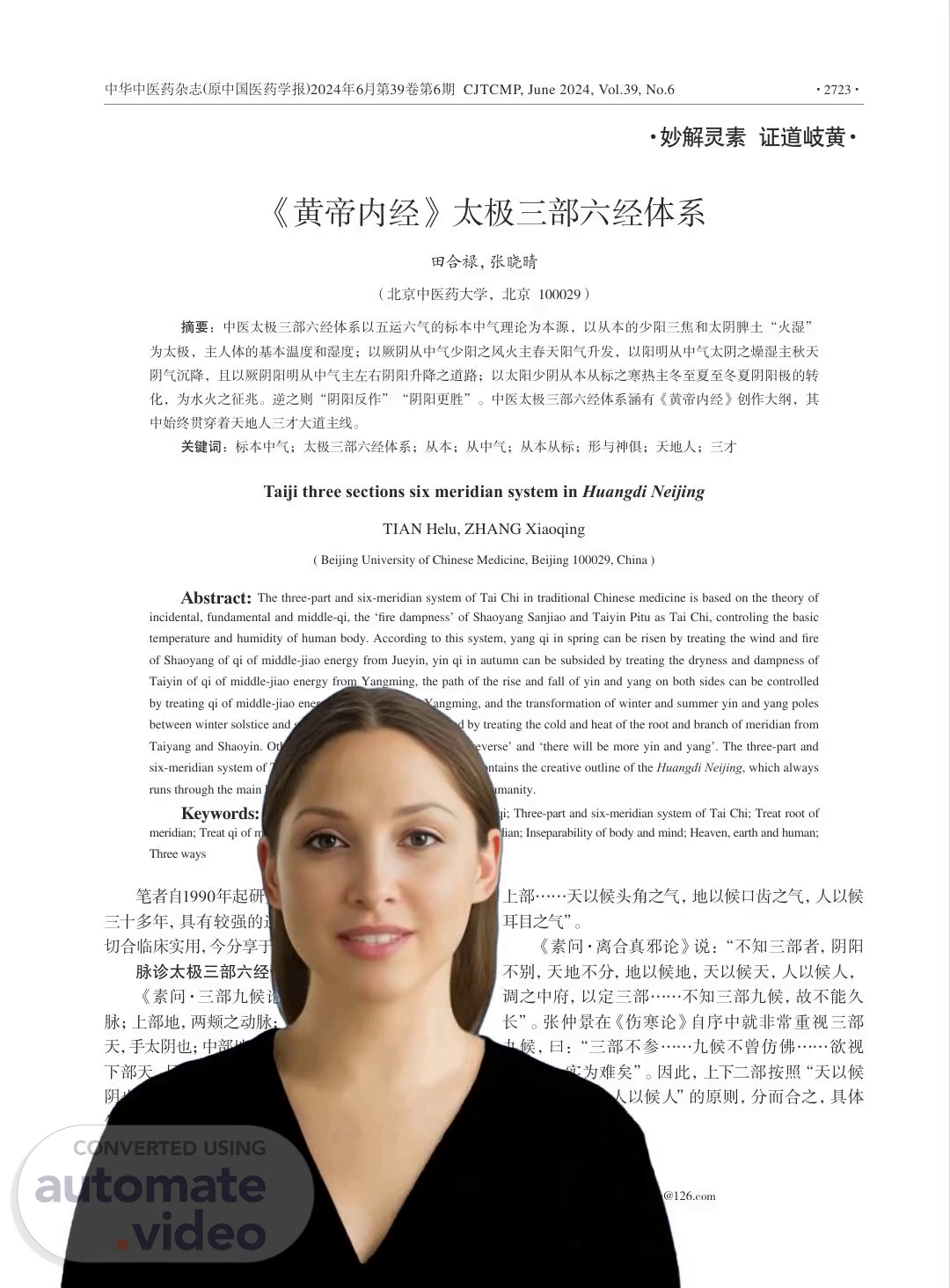 [Virtual Presenter] 《黄帝内经》中具备宏伟框架,贯穿宇宙三要素和人类生活的主线。关键词:偶然、根本和中气;太极的三部分六经系统;从根本开始;从中气开始;从根本和分支开始;形与神相统一;宇宙、世界和人类;三元素。.