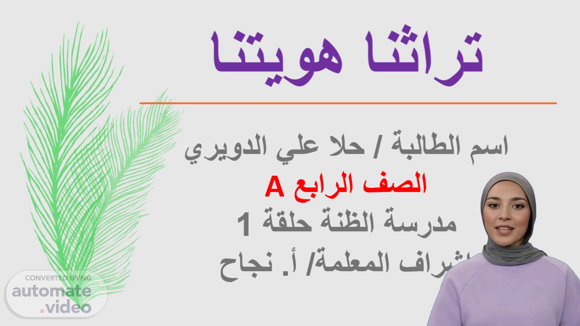 [Virtual Presenter] مرحبا وأهلا بكم في هذه الدورة التدريبية، اليوم سوف نتحدث عن موضوع هام جدا وهو تراثنا وكيفية الحفاظ عليه كجزء أساسي من هويتنا. سنتعرف على أهمية تراثنا وأثره الكبير على حياتنا ومجتمعنا. هذه الدورة مقدمة من مدرسة الظنة بالتعاون مع أستاذتنا المتميزة أ. نجاح. نأمل أن تستمتعوا وتستفيدوا من هذه الدورة..