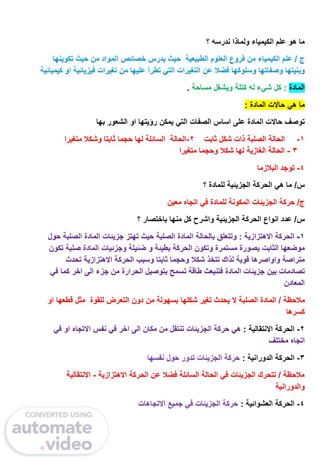 ؟ هسردن اذاملو ءايميكلا ملع وه ام ةداملا :لك ءيش هل ةلتك ةحاسم لغشيو. ام يه تلااح ةداملا : اهب روعشلا وا اهتيؤر نكمي يتلا تافصلا ساسا ىلع ةداملا تلااح فصوت 1- ةلاحلا تباث لكش تاذ ةبلصلا 2-ةلاحلا لئاسلا اريغتم لاكشو اتباث امجح اهل ة 3 - ةلاحلا ةيزاغلا اريغتم امجحو لاكش اهل 4- امزلابلا دجوت ؟ ةداملل ةيئيزجلا ةكرحلا يه ام /س نيعم هاجتا يف ةداملل ةنوكملا تائيزجلا ةكرح /ج ؟ راصتخاب اهنم لك حرشاو ةيئيزجلا ةكرحلا عاونا ددع /س 1 ةظحلاملكش ريغت ثدحي لا ةبلصلا ةداملا / ةوقلل ضرعتلا نود نم ةلوهسب اه وا اهعطق لثم اهرسك 2- : ةيلاقتنلاا ةكرحلا 3- ا ةينارودلا ةكرحل : اهسفن لوح رودت تائيزجلا ةكرح ةيزازتهلاا ةكرحلا نع لاضف ةلئاسلا ةلاحلا يف تائيزجلا كرحتت / ةظحلام- ةيلاقتنلاا ةينارودلاو 4- : ةيئاوشعلا ةكرحلا تاهاجتلاا عيمج يف تائيزجلا ةكرح.