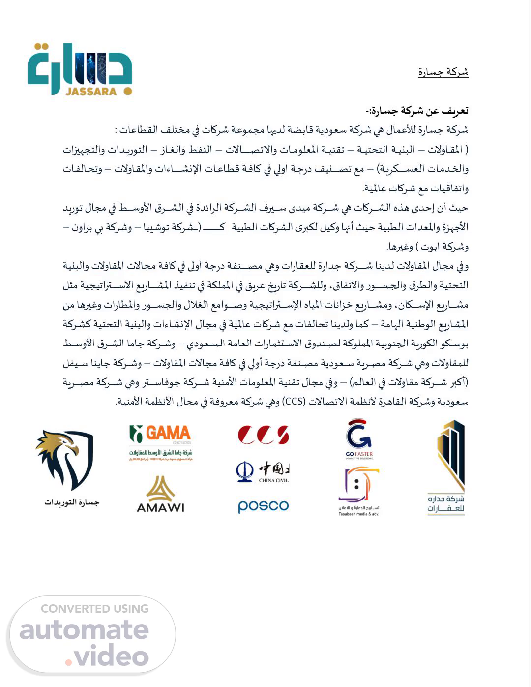 ةراسج ةكرش ةراسج ةكرش نع فيرعت: - : تاعاطقلا فلتخم يف تاكرش ةعومجم اهيدل ةضباق ةيدوعس ةكرش يه لامعلأل ةراسج ةكرش ت اااااقلما (– ةاااايت تلا ةااااينبلا– ت اااااااااااااااااا ت ا تااااامولعلما ةااااينقت– اااااغلا طفنلا– تا تجتلا تاداااايروتلا ةاااير اااااااااااااسعلا تاااامداااخلا – ت ااااقلما تا اااااااااااااااا ا تااااعااااطق ةاااوااااك يف يت ا ةاااجرد فينااااااااااااا ت عم– تاااافلاااا ت ةيلماع تاكرش عم تايقافتا . ديروت لاجم يف طاااااااااس ا رااااااااا لا يف ةد ارلا ةكرااااااااا لا لأا اااااااااس ىديم ةكراااااااااش يه تاكرااااااااا لا هذه ىدحإ نأ ثيح اب شوت ةكر اااااااا( ااااااااااااااااااااااااااااااااك ةيبطلا تاكر لا ىاب ل ليك اهنأ ثيح ةيبطلا تادعلما ةزتج ا– ن ارب يب ةكرش – .اها غ توبا ةكرش ةاينبلا ت ااقلما ت ااجم ةاوااك يف ت أ ةاجرد ةافنااااااااااااا م يه تارااقعلل ةراداج ةاكراااااااااااااش اانيدال ت ااقلما لااجم يف ل م ةيجيتاا ااااااااااااس ا ع رااااااااااااا لما ذيفنت يف ة لملما يف ايرع ذيرات ةكراااااااااااا لل ر افة ا روااااااااااااسجلا رطلا ةيت تلا لا عماواااااااااا ةيجيتاا ااااااااااس ا هايلما تاةازع ع رااااااااااا م رنااااااااااااس ا ع رااااااااااا م م اها غ تاراطلما روااااااااااسجلا للاغ ةماتلا ةيننولا ع راا لما– ةكرا ك ةيت تلا ةينبلا تا اا ا لاجم يف ةيلماع تاكراش عم تافلا ت انيدل امك دوعاااااسلا ةماعلا تارام ااااااس ا دنااااا ل ةكولملما ةيلمونجلا ةيروالا وااااااسوب– طاااااس ا رااااا لا اماج ةكراااااش يدوعاااااس ةيرااااا م ةكراااااش يه ت اقملل ت اقلما ت اجم ةواك يف يت أ ةجرد ةفنااااا م ة– لفياااااس انياج ةكراااااش لاعلا يف ت اقم ةكراااااااااش ابكأ(– ةيرااااااااا م ةكراااااااااش يه ا اااااااااساووج ةكراااااااااش ةينم ا تامولعلما ةينقت لاجم يف CCS) ت ا ت ا ةمظة ةرهاقلا ةكرش ةيدوعس .ةينم ا ةمظة ا لاجم يف ةو رعم ةكرش يه.