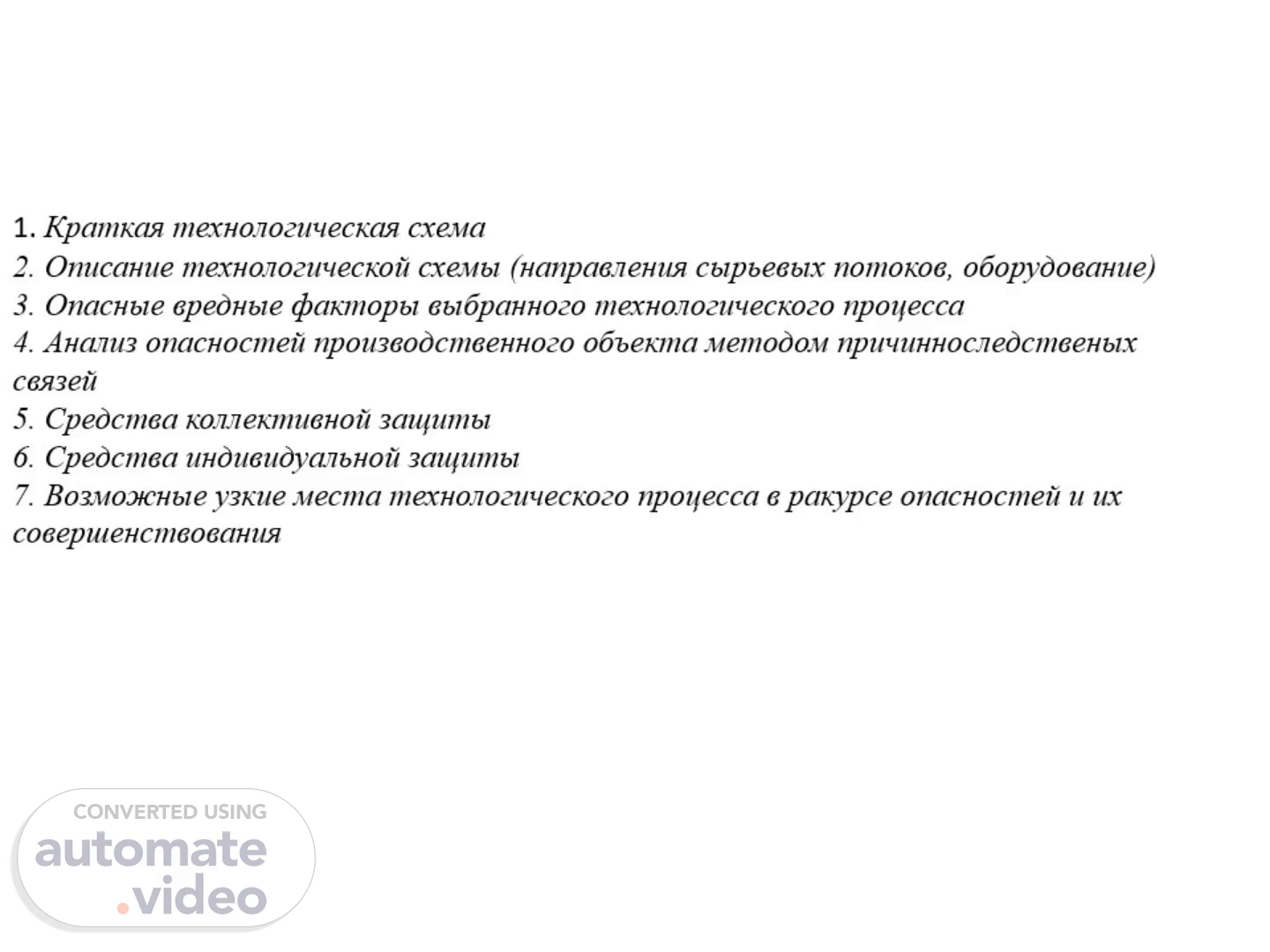 1. Краткая технологическая схема 2. Описание технологической схемы (направления сырьевых потоков, оборудование) 3. Опасные вредные факторы выбранного технологического процесса 4. Анализ опасностей производственного объекта методом причинноследственых связей 5. Средства коллективной защиты 6. Средства индивидуальной защиты 7. Возможные узкие места технологического процесса в ракурсе опасностей и их совершенствования.