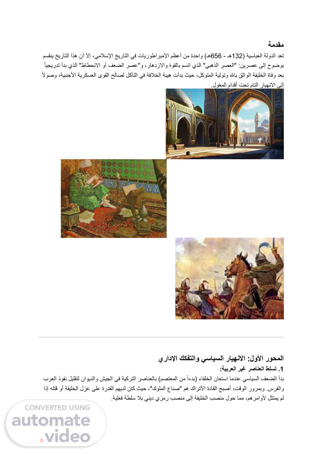 [Audio] ﺔﻣدﻘﻣ ) ﺔﯾﺳﺎﺑﻌﻟا ﺔﻟودﻟا دﻌﺗ132 ـھ- 656 مﺳﻘﻧﯾ ﺦﯾرﺎﺗﻟا اذھ نأ ﻻإ ،ﻲﻣﻼﺳﻹا ﺦﯾرﺎﺗﻟا ﻲﻓ تﺎﯾروطارﺑﻣﻹا مظﻋأ نﻣ ةدﺣاو (ـھ ًﺎﯾﺟﯾردﺗ أدﺑ يذﻟا "طﺎطﺣﻧﻻا وأ فﻌﺿﻟا رﺻﻋ"و ،رﺎھدزﻻاو ةوﻘﻟﺎﺑ مﺳﺗا يذﻟا "ﻲﺑھذﻟا رﺻﻌﻟا" :نﯾرﺻﻋ ﻰﻟإ حوﺿوﺑ ﻛوﺗﻣﻟا ﺔﯾﻟوﺗو ﻟﻠﮫﺎﺑ ﻖﺛاوﻟا ﺔﻔﯾﻠﺧﻟا ةﺎﻓو دﻌﺑ ًﻻوﺻو ،ﺔﯾﺑﻧﺟﻷا ﺔﯾرﻛﺳﻌﻟا ىوﻘﻟا ﺢﻟﺎﺻﻟ لﻛﺂﺗﻟا ﻲﻓ ﺔﻓﻼﺧﻟا ﺔﺑﯾھ تأدﺑ ثﯾﺣ ،ل .لوﻐﻣﻟا مادﻗأ تﺣﺗ مﺎﺗﻟا رﺎﯾﮭﻧﻻا ﻰﻟإ يرادﻹا كﻛﻔﺗﻟاو ﻲﺳﺎﯾﺳﻟا رﺎﯾﮭﻧﻻا :لوﻷا روﺣﻣﻟا 1 :ﺔﯾﺑرﻌﻟا رﯾﻏ رﺻﺎﻧﻌﻟا طﻠﺳﺗ . برﻌﻟا ذوﻔﻧ لﯾﻠﻘﺗﻟ ناوﯾدﻟاو شﯾﺟﻟا ﻲﻓ ﺔﯾﻛرﺗﻟا رﺻﺎﻧﻌﻟﺎﺑ (مﺻﺗﻌﻣﻟا نﻣ ًاءدﺑ) ءﺎﻔﻠﺧﻟا نﺎﻌﺗﺳا ﺎﻣدﻧﻋ ﻲﺳﺎﯾﺳﻟا فﻌﺿﻟا أدﺑ اذإ ﮫﻠﺗﻗ وأ ﺔﻔﯾﻠﺧﻟا لزﻋ ﻰﻠﻋ ةردﻘﻟا مﮭﯾدﻟ نﺎﻛ ثﯾﺣ ،"كوﻠﻣﻟا عﺎﻧﺻ" مھ كارﺗﻷا ةدﺎﻘﻟا ﺢﺑﺻأ ،تﻗوﻟا رورﻣﺑو .سرﻔﻟاو ﻠﺧﻟا بﺻﻧﻣ لوﺣ ﺎﻣﻣ ،مھرﻣاوﻷ لﺛﺗﻣﯾ مﻟ .ﺔﯾﻠﻌﻓ ﺔطﻠﺳ ﻼﺑ ﻲﻧﯾد يزﻣر بﺻﻧﻣ ﻰﻟإ ﺔﻔﯾ.
