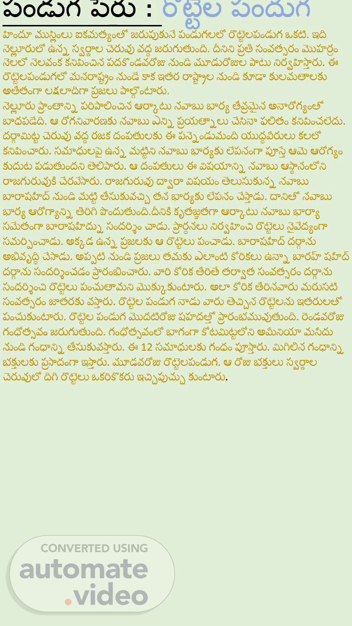 [Audio] పండుగ పేరు : రొట్టెల పందుగ హిందూ ముస్లింలు ఐకమత్యంతో జరుపుకునే పండుగలలో రొట్టెలపండుగ ఒకటి. ఇది నెల్లూరులో ఉన్న స్వర్ణాల చెరువు వద్ద జరుగుతుంది. దీనిని ప్రతి సంవత్సరం మొహర్రం నెలలో నెలవంక కనిపించిన పదకొండవరోజు నుండి మూడురోజుల పాటు నిర్వహిస్తారు. ఈ రొట్టెలపండుగలో మనరాష్ట్రం నుండే కాక ఇతర రాష్ట్రాల నుండి కూడా కులమతాలకు అతీతంగా లక్షలాదిగా ప్రజలు పాల్గొంటారు. నెల్లూరు ప్రాంతాన్ని పరిపాలించిన ఆర్కాటు నవాబు భార్య తీవ్రమైన అనారోగ్యంతో బాధపడేది. ఆ రోగనివారణకు నవాబు ఎన్ని ప్రయత్నాలు చేసినా ఫలితం కనిపించలేదు. దర్గామిట్ట చెరువు వద్ద రజక దంపతులకు ఈ పన్నెండుమంది యుద్ధవీరులు కలలో కనిపించారు. సమాధులపై ఉన్న మట్టిని నవాబు భార్యకు లేపనంగా పూస్తే ఆమె ఆరోగ్యం కుదుట పడుతుందని తెలిపారు. ఆ దంపతులు ఈ విషయాన్ని నవాబు ఆస్థానంలోని రాజగురువుకి చేరవేసారు. రాజగురువు ద్వారా విషయం తెలుసుకున్న నవాబు బారాషహీద్ నుండి మట్టి తీసుకువచ్చి తన భార్యకు లేపనం చేస్తాడు. దానితో నవాబు భార్య ఆరోగ్యాన్ని తిరిగి పొందుతుంది.దీనికి కృతజ్ఞతగా ఆర్కాటు నవాబు భార్యా సమేతంగా బారాషహీద్ను సందర్శిం చాడు. ప్రార్ధనలు నిర్వహించి రొట్టెలు నైవేద్యంగా సమర్పించాడు. అక్కడ ఉన్న ప్రజలకు ఆ రొట్టెలు పంచాడు. బారాషహీద్ దర్గాను అభివృద్ధి చేసాడు. అప్పటి నుండి ప్రజలు తమకు ఎలాంటి కోరికలు ఉన్నా బారహ్ షహీద్ దర్గాను సందర్శించడం ప్రారంభించారు. వారి కోరిక తీరితే తర్వాత సంవత్సరం దర్గాను సందర్శించి రొట్టెలు పంచుతామని మొక్కుకుంటారు. అలా కోరిక తీరినవారు మరుసటి సంవత్సరం జాతరకు వస్తారు. రొట్టెల పండుగ నాడు వారు తెచ్చిన రొట్టెలను ఇతరులతో పంచుకుంటారు. రొట్టెల పండుగ మొదటిరోజు షహదత్తో ప్రారంభమువుతుంది. రెండవరోజు గంధోత్సవం జరుగుతుంది. గంధోత్సవంలో భాగంగా కోటమిట్టలోని అమీనియా మసీదు నుండి గంధాన్ని తీసుకువస్తారు. ఈ 12 సమాధులకు గంధం పూస్తారు. మిగిలిన గంధాన్ని భక్తులకు ప్రసాదంగా ఇస్తారు. మూడవరోజు రొట్టెలపండుగ. ఆ రోజు భక్తులు స్వర్ణాల చెరువులో దిగి రొట్టెలు ఒకరికొకరు ఇచ్చిపుచ్చు కుంటారు. పండుగ పేరు : రొట్టెల పందుగ హిందూ ముస్లింలు ఐకమత్యంతో జరుపుకునే పండుగలలో రొట్టెలపండుగ ఒకటి. ఇది నెల్లూరులో ఉన్న స్వర్ణాల చెరువు వద్ద జరుగుతుంది. దీనిని ప్రతి సంవత్సరం మొహర్రం నెలలో నెలవంక కనిపించిన పదకొండవరోజు నుండి మూడురోజుల పాటు నిర్వహిస్తారు. ఈ రొట్టెలపండుగలో మనరాష్ట్రం నుండే కాక ఇతర రాష్ట్రాల నుండి కూడా కులమతాలకు అతీతంగా లక్షలాదిగా ప్రజలు పాల్గొంటారు. నెల్లూరు ప్రాంతాన్ని పరిపాలించిన ఆర్కాటు నవాబు భార్య తీవ్రమైన అనారోగ్యంతో బాధపడేది. ఆ రోగనివారణకు నవాబు ఎన్ని ప్రయత్నాలు చేసి