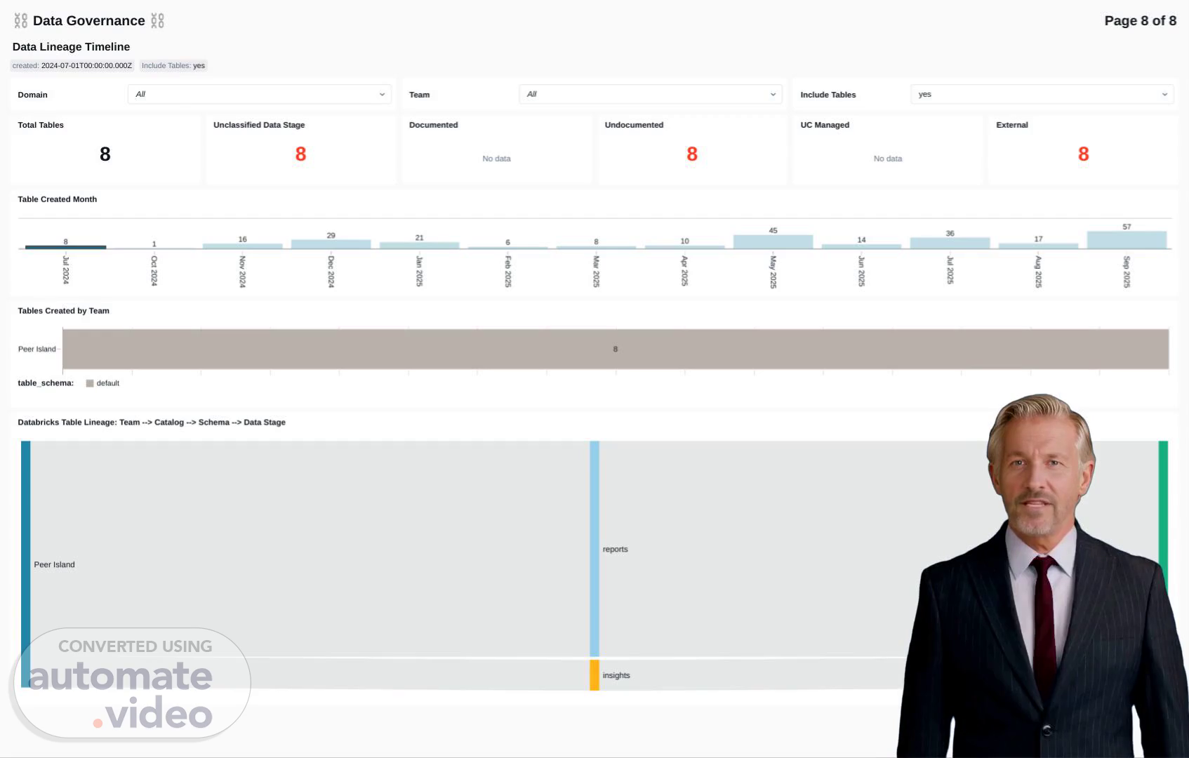 [Audio] Our data governance framework has been designed to provide transparency and accountability for our data assets. The framework consists of several key components, including a centralized data lineage timeline, which provides visibility into the movement and transformation of our data across different teams, catalogs, and schemas. This timeline enables us to track changes made to our data over time, identify potential issues, and take corrective action when necessary. The data governance process also ensures that all tables are properly documented and tracked, with a focus on ensuring compliance with regulatory requirements. This documentation helps us to maintain accurate records of our data, which can be used to support business decisions and drive informed outcomes. In addition to these core components, we have established a set of standardized processes and tools to facilitate data management and analysis. These include data engineering job runs and data ingestion pipelines, which enable us to efficiently manage large datasets and extract valuable insights from our data. By implementing this comprehensive data governance framework, we are able to maintain a high level of data quality and security, while also supporting business decision-making through data-driven insights..