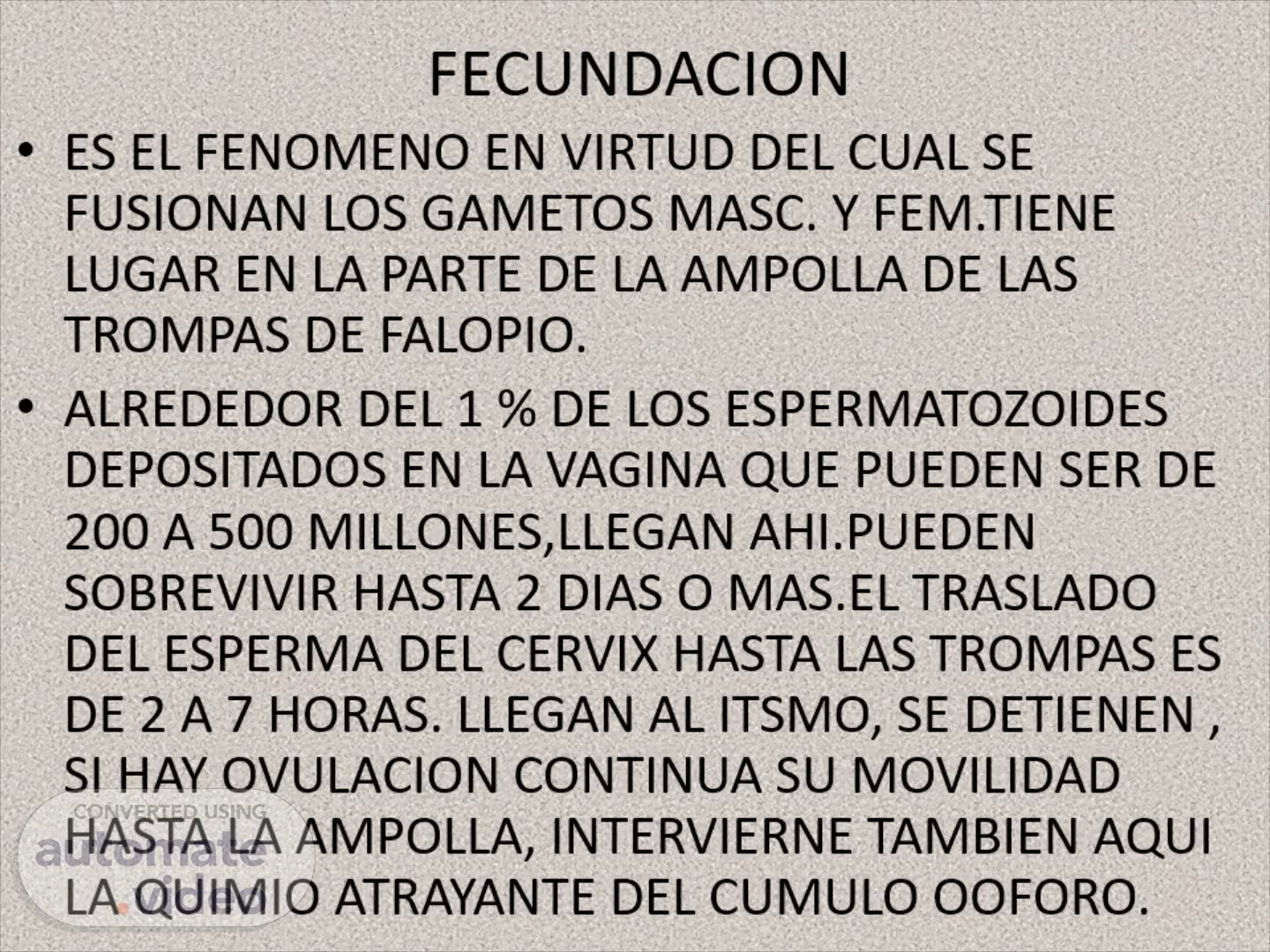 FECUNDACION. ES EL FENOMENO EN VIRTUD DEL CUAL SE FUSIONAN LOS GAMETOS MASC. Y FEM.TIENE LUGAR EN LA PARTE DE LA AMPOLLA DE LAS TROMPAS DE FALOPIO. ALREDEDOR DEL 1 % DE LOS ESPERMATOZOIDES DEPOSITADOS EN LA VAGINA QUE PUEDEN SER DE 200 A 500 MILLONES,LLEGAN AHI.PUEDEN SOBREVIVIR HASTA 2 DIAS O MAS.EL TRASLADO DEL ESPERMA DEL CERVIX HASTA LAS TROMPAS ES DE 2 A 7 HORAS. LLEGAN AL ITSMO, SE DETIENEN , SI HAY OVULACION CONTINUA SU MOVILIDAD HASTA LA AMPOLLA, INTERVIERNE TAMBIEN AQUI LA QUIMIO ATRAYANTE DEL CUMULO OOFORO..