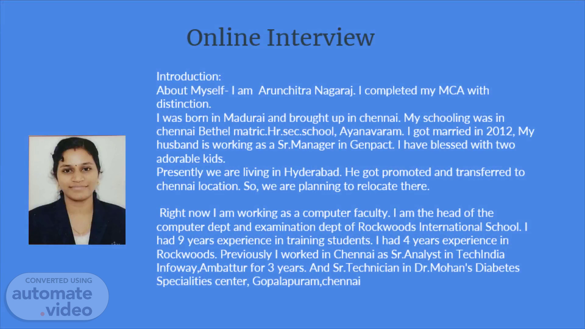 Online Interview. Introduction: About Myself- I am Arunchitra Nagaraj. I completed my MCA with distinction. I was born in Madurai and brought up in chennai. My schooling was in chennai Bethel matric.Hr.sec.school, Ayanavaram. I got married in 2012, My husband is working as a Sr.Manager in Genpact. I have blessed with two adorable kids. Presently we are living in Hyderabad. He got promoted and transferred to chennai location. So, we are planning to relocate there. Right now I am working as a computer faculty. I am the head of the computer dept and examination dept of Rockwoods International School. I had 9 years experience in training students. I had 4 years experience in Rockwoods. Previously I worked in Chennai as Sr.Analyst in TechIndia Infoway,Ambattur for 3 years. And Sr.Technician in Dr.Mohan's Diabetes Specialities center, Gopalapuram,chennai.