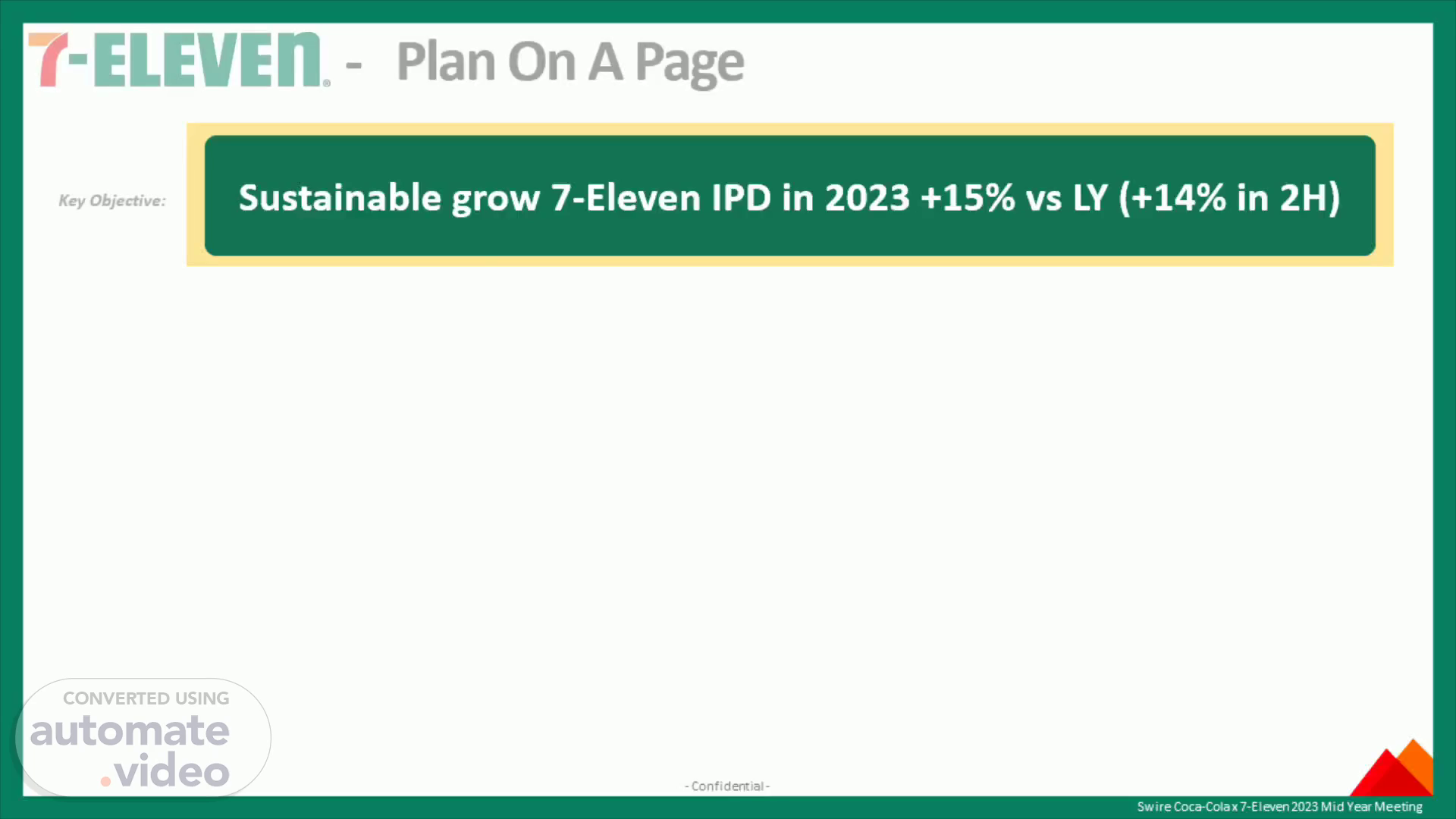 [Audio] At 7-Eleven IPD, we are dedicated to growing our business sustainably. Our aim is to obtain a 15% growth in 2023 in comparison with the year prior. To reach this objective, we have designed a plan to arouse new interest in consumers, provide value and affordable products, and initiate corporate social responsibility programs. To add an extra element of fun and enthusiasm, we are working together with 7 Café+ and profiting from sudden impulse purchases. Our vision is to be the exclusive supplier of joy to our customers. We also endeavor to make sure that more customers come to our stores due to our quality products for a good value of money, and to upgrade the customer experience. We are inviting customers to consider food, consider 7-Eleven. As the table shows, our 2023 KPI targets are bold yet achievable. We are aiming for a 16% increase in GSV for 2023 in comparison with the 2022 actual GSV, and a 13.7% surge in 2H GSV this year. We are sure that, with our plan and dedication, we can achieve our goal of sustainable growth..