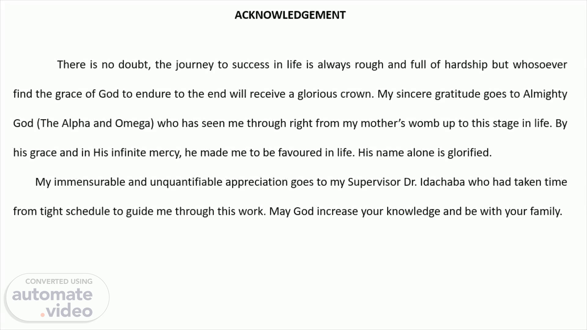 ACKNOWLEDGEMENT There is no doubt, the journey to success in life is always rough and full of hardship but whosoever find the grace of God to endure to the end will receive a glorious crown. My sincere gratitude goes to Almighty God (The Alpha and Omega) who has seen me through right from my mother’s womb up to this stage in life. By his grace and in His infinite mercy, he made me to be favoured in life. His name alone is glorified. My immensurable and unquantifiable appreciation goes to my Supervisor Dr. Idachaba who had taken time from tight schedule to guide me through this work. May God increase your knowledge and be with your family..